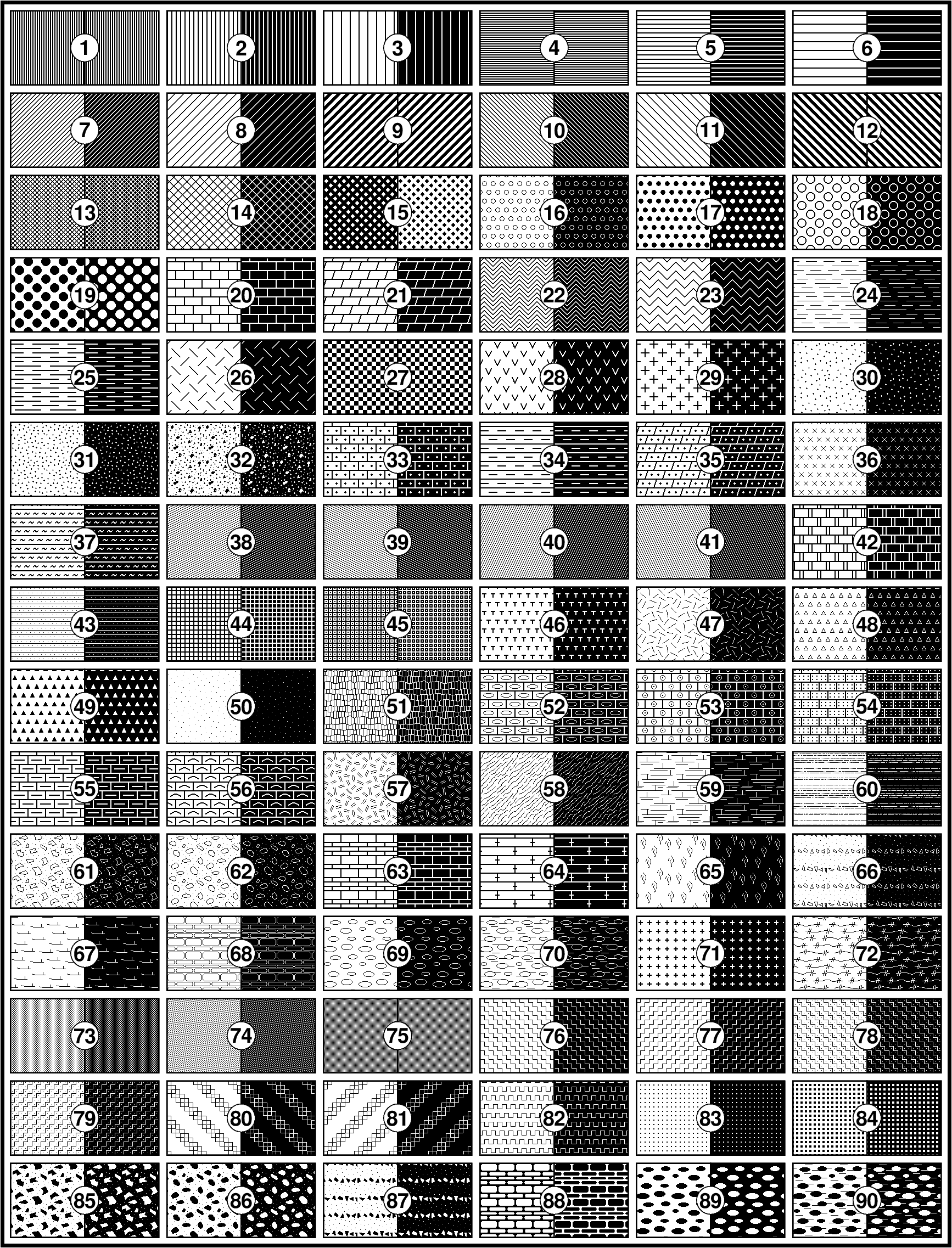 下图列出了GMT中预定义的90种位图图案(右键查看大图并放大才能看到差异),所有图案 都是使用默认的黑白色在 dpi=300的环境下生成的。每张小图中左半部分使用 -Gp 绘制,右半部分使用 -GP 绘制。