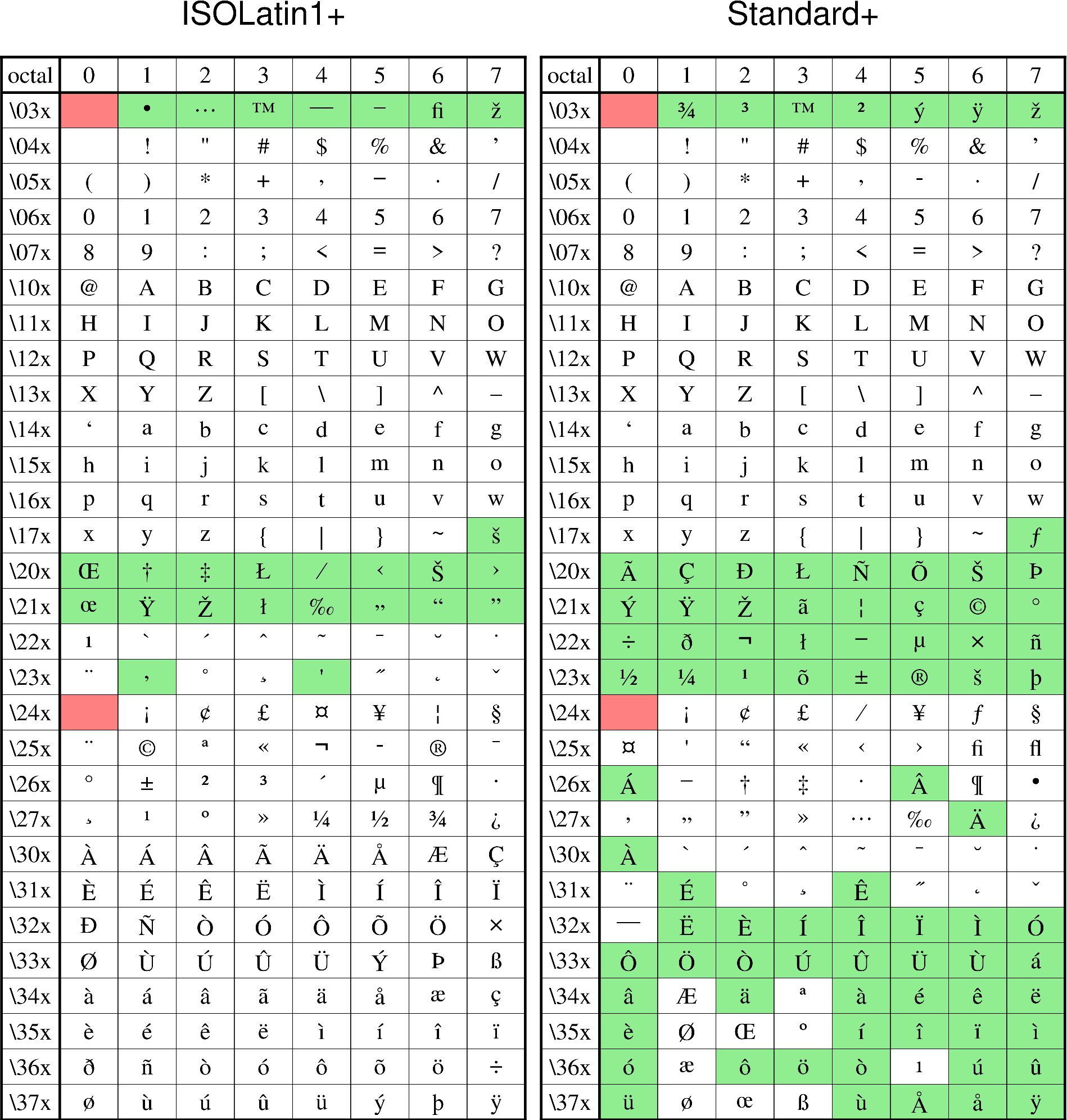 字符在 Standard+ 表内:该表内的字符是与 ISOLatin1+ 中的字符完全重合的, 建议在 ISOLatin1+ 表中找到自己需要的字符,然后使用其对应的八进制吗
