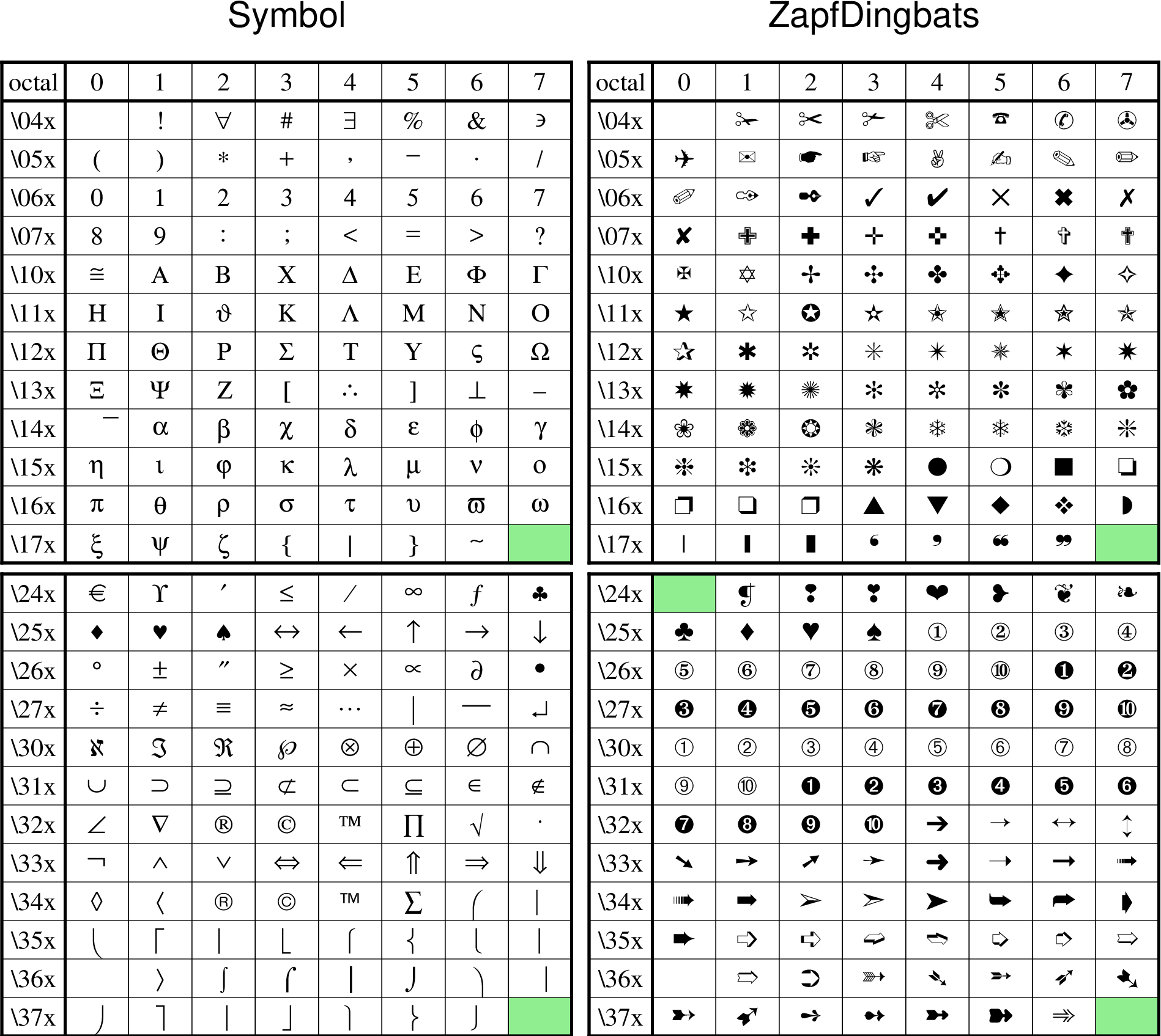 字符在 ZapfDingbats 表内:将文本字体设置为34号字体,并使用该字符对应的八进制码