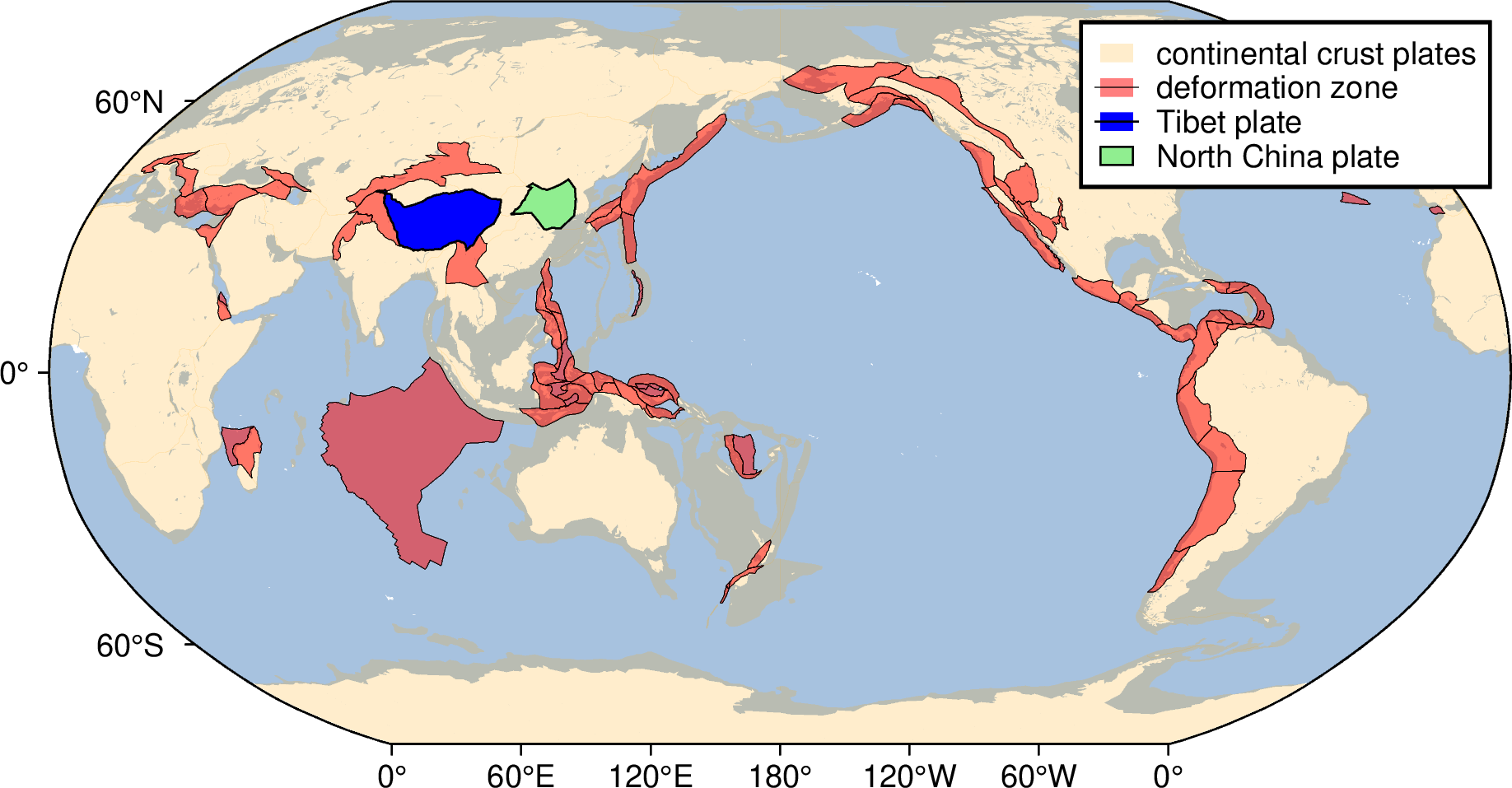下面的例子展示了如何根据头段记录提取大陆地壳板块、变形带板块,以及提取青藏高原板块、