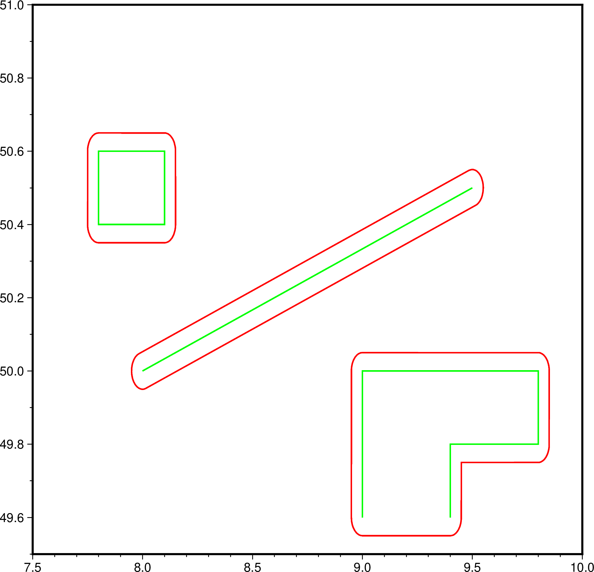目前,缓冲区生成算法是基于笛卡尔坐标实现的,因此会将输入的地理坐标假定为笛卡尔 坐标,这在使用地理坐标时,通常是不合适的。正常的做法是,先将多边形坐标投影,然后计算 缓冲区,最后再将缓冲区做投影逆变换得到地理坐标,其中的投影变换或逆变换可通过 mapproject 实现,选择的投影最好为等面积投影。下面分别展示不使用投影 和使用投影的地理坐标缓冲区计算。