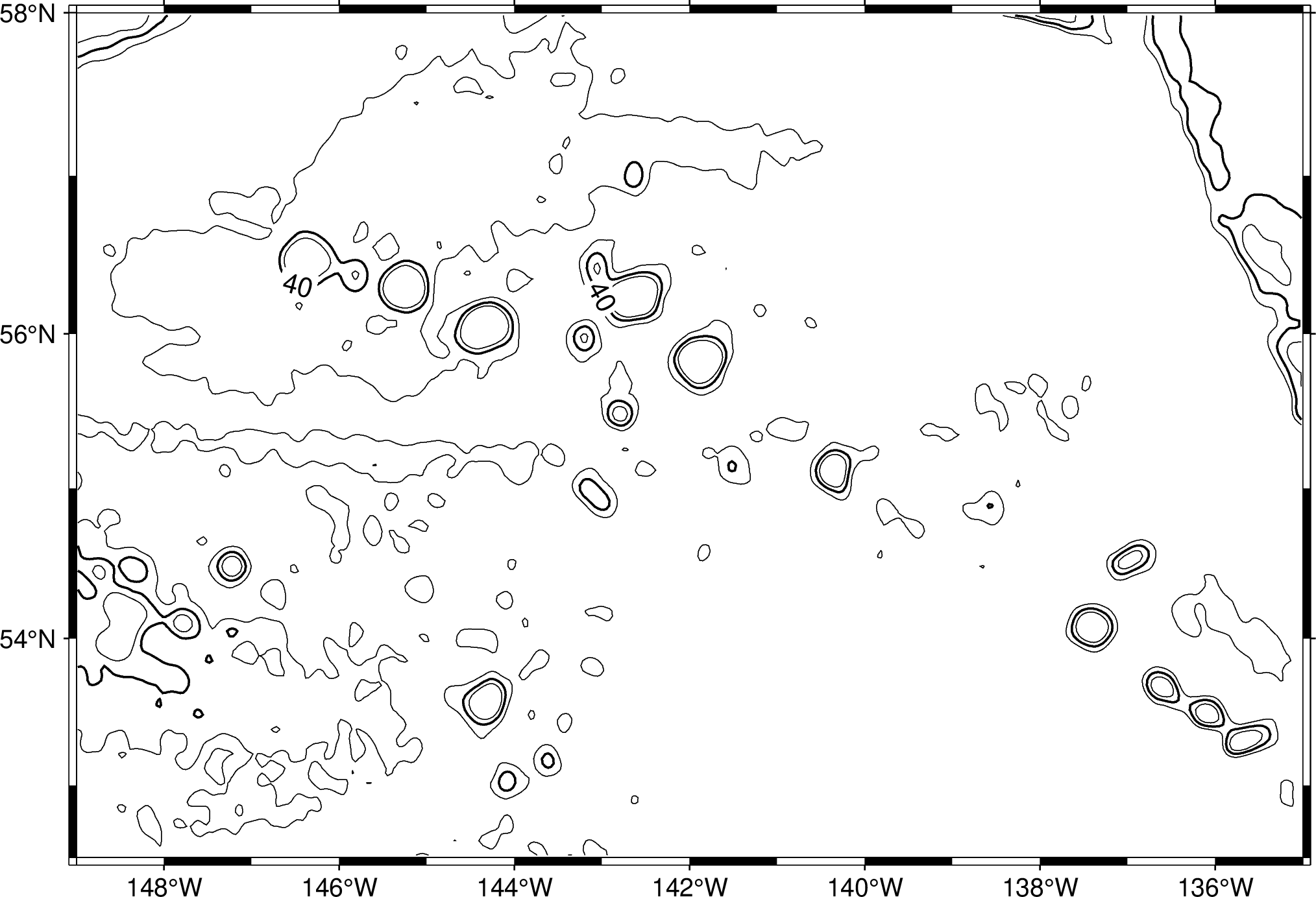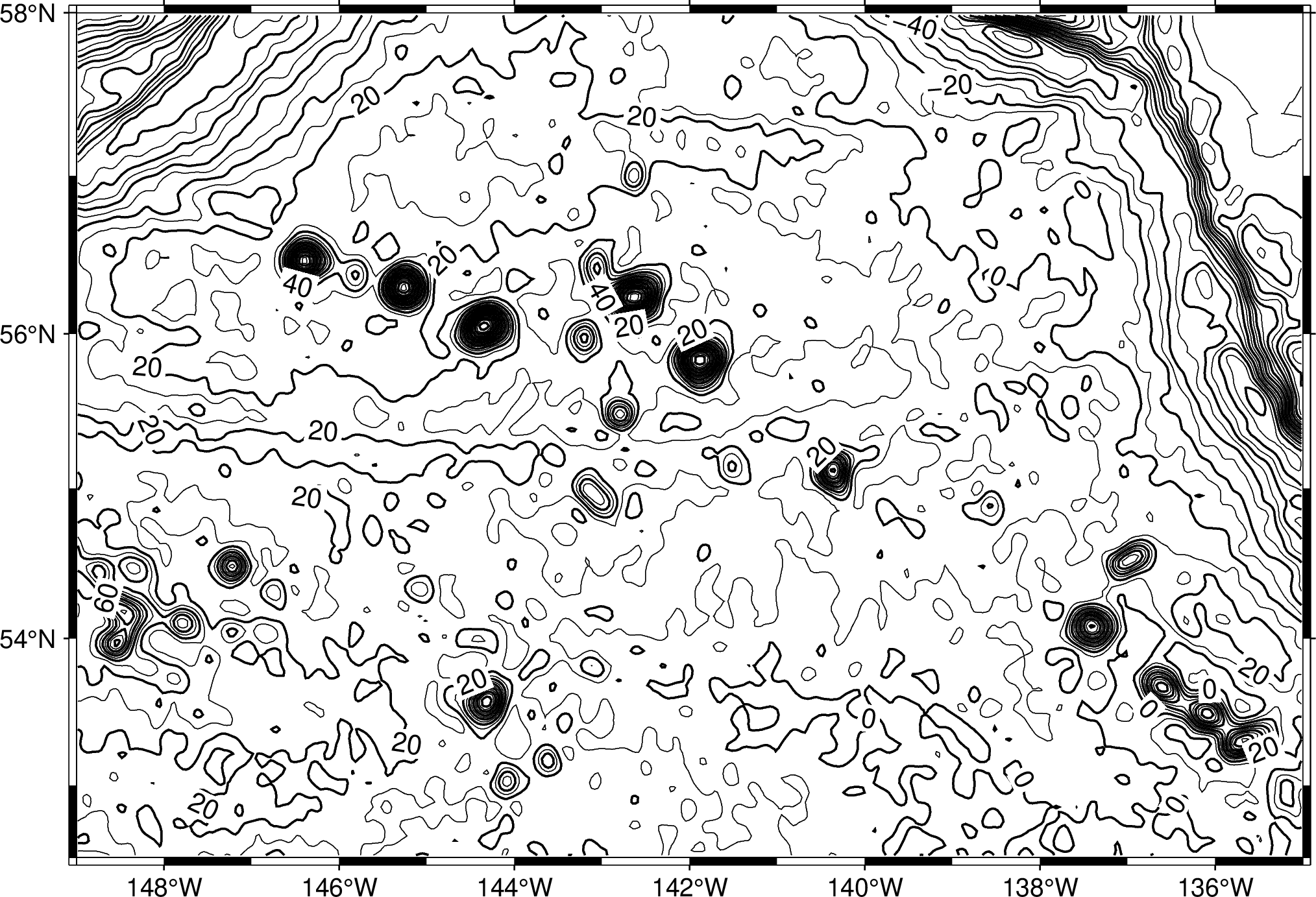 使用网格文件AK_gulf_grav.nc,以10为间隔绘制等值线,以20为间隔标注,标注文字大小10p。