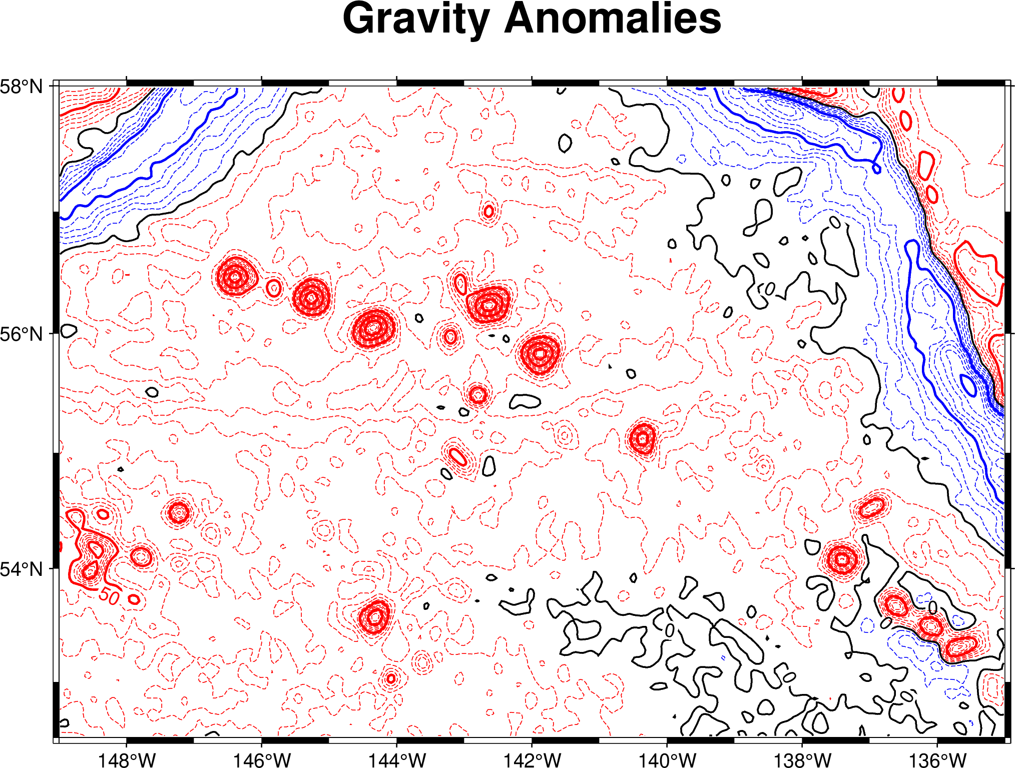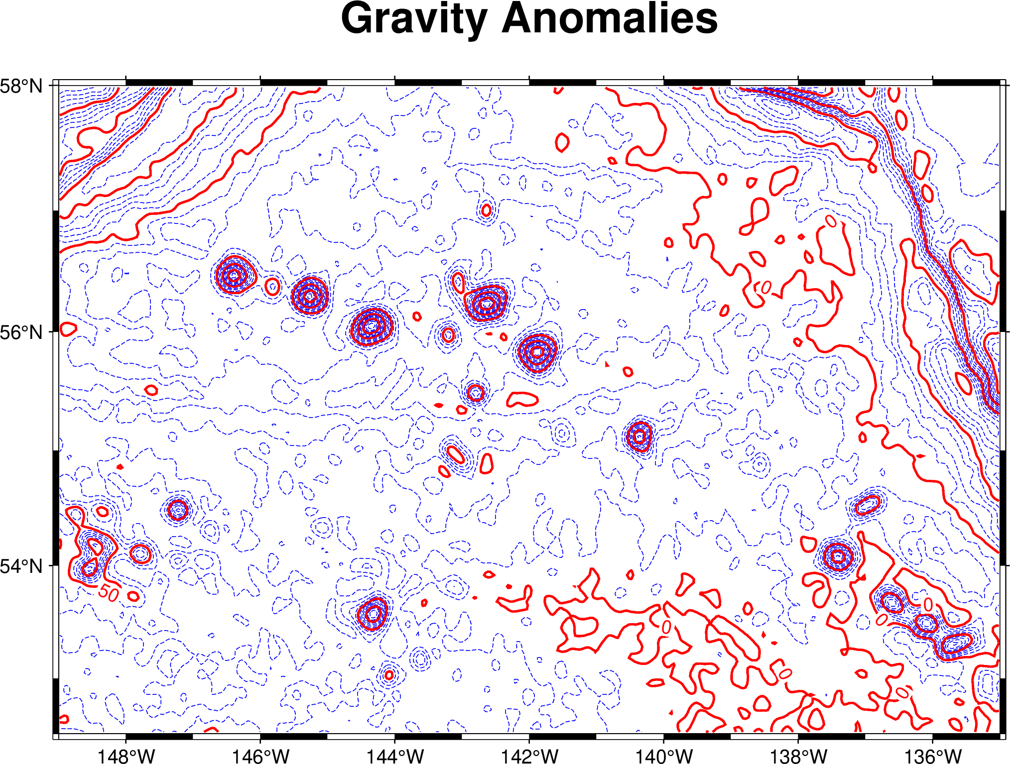 gmt grdcontour @AK_gulf_grav.nc -JM16c -C10 -A50 -Baf -B+t"Gravity Anomalies" -Ln -Wathick,blue -Wcthinnest,blue,-