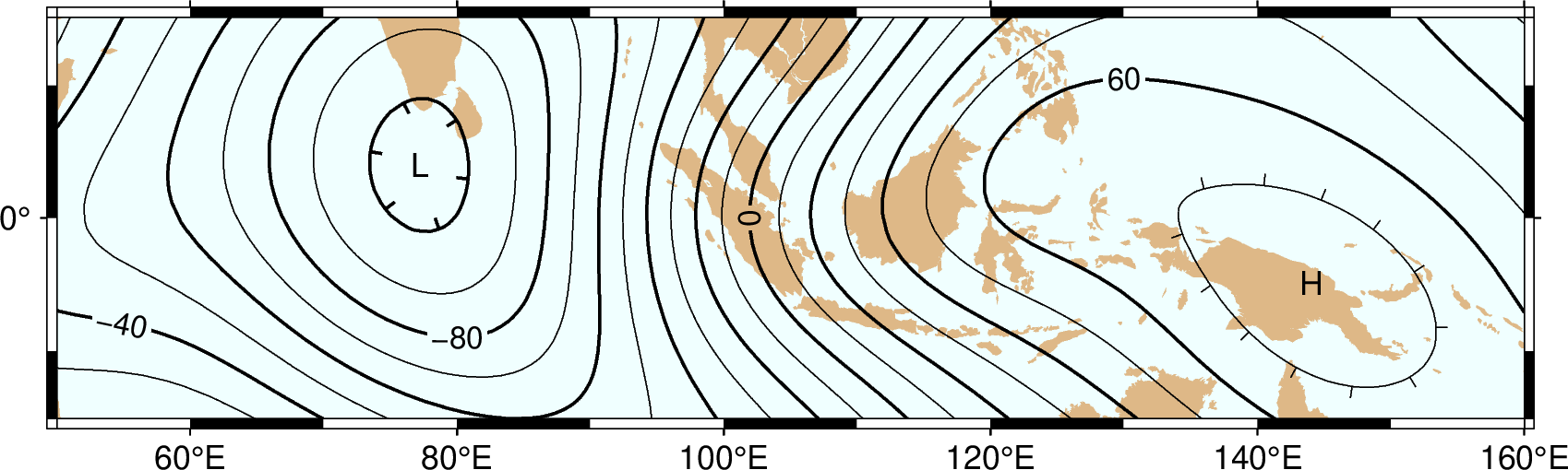 gmt grdcontour @App_O_geoid.nc -B20f10 -BWSne -C10 -A20+f8p -Gn1/1i -S10 -T+lLH