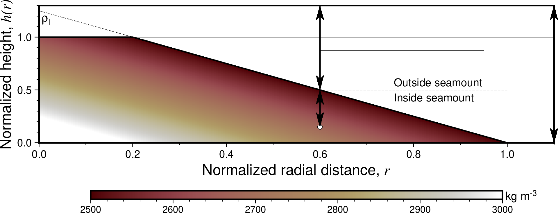 设置参考海山密度相关的参数,该参数用于随深度变化的径向(即下图中的 r 轴向)密度函数。 以 kg/m^3 或 g/cm^3 为单位设置海山的密度,以 m 为单位设置固定参考高度 H [0]。 使用 +d 和 +p 选项改变水压驱动的侧面密度 densify ,以及可变密度的指数 power ,即下图中的 \(\Delta \rho_f\) 和 p ,默认 power 为 1,即为线性 变化。 下图中,h(r) 是海山在 r 位置处的高度,z(r) 与 h(r) 含义相近,不过在海山 内部。如果海山为平顶海山(见 -F ),h(r) 仍然为未截断的情况。 注 :如果使用 -W 选项,将会报告每个海山的平均密度。径向密度函数的定义为 \(\Delta \rho_s = \rho_h - \rho_l\) ,其中 \(\rho_h\) 即参数中的 rho_h , \(\rho_l\) 为参数中的 rho_l ,分别为密度的两个极值(high 和 low)。\(\Delta \rho_f\) 为参数中的 densify