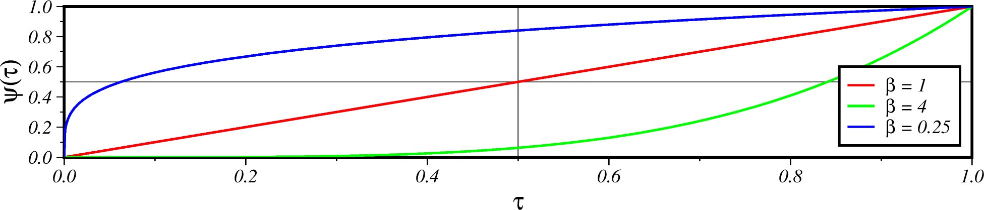 通过上述函数,可以控制滑坡随时间演化的速度。线性的曲线意味着在质量在滑动期间 以恒定的速度沉积。调整 \(\beta\) 可以调整质量变化集中的时间, \(\beta < 1\) 表示发生在总体时间的早期,\(\beta < 1\) 表示发生在整个 过程的晚期。