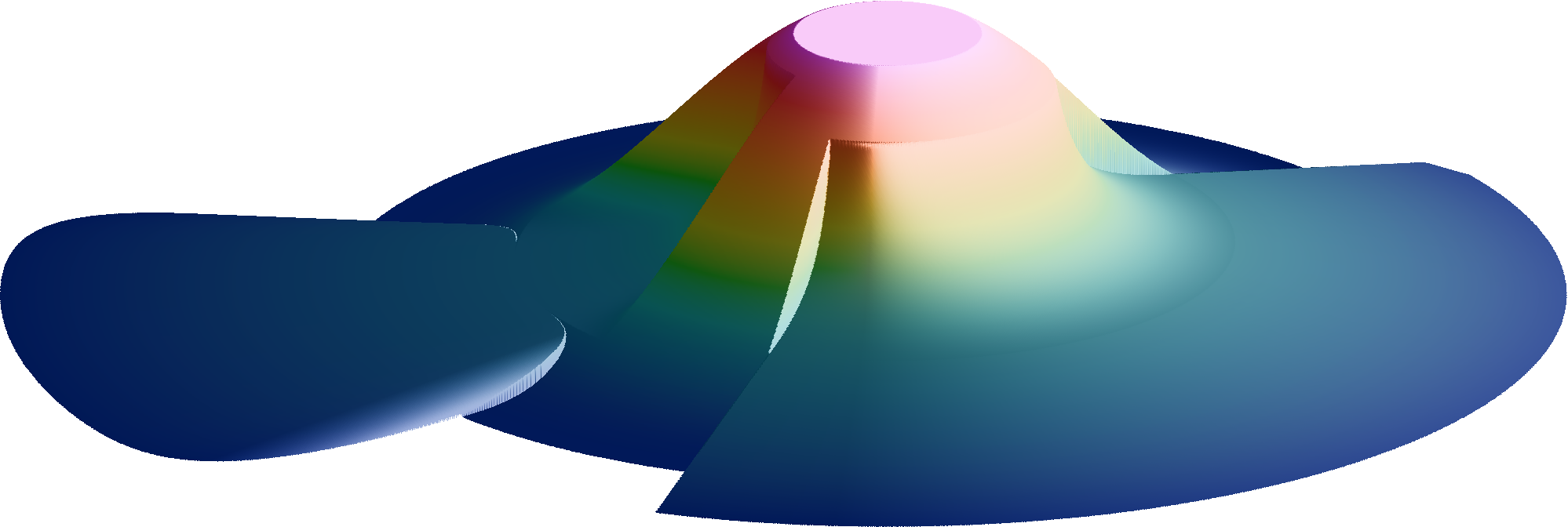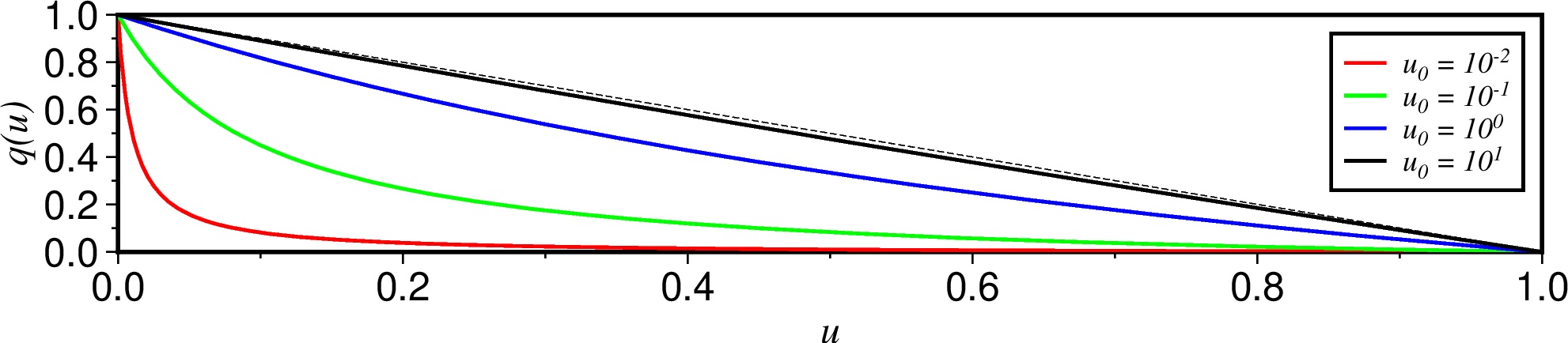 上图为多种归一化的径向滑坡形状剖面曲线 \(q(u)\) ,可通过 +u 改变。例如: 圆锥形海山的滑坡在上图虚线以下。较小的 \(u_0\) 将会导致更深入地切入海山。