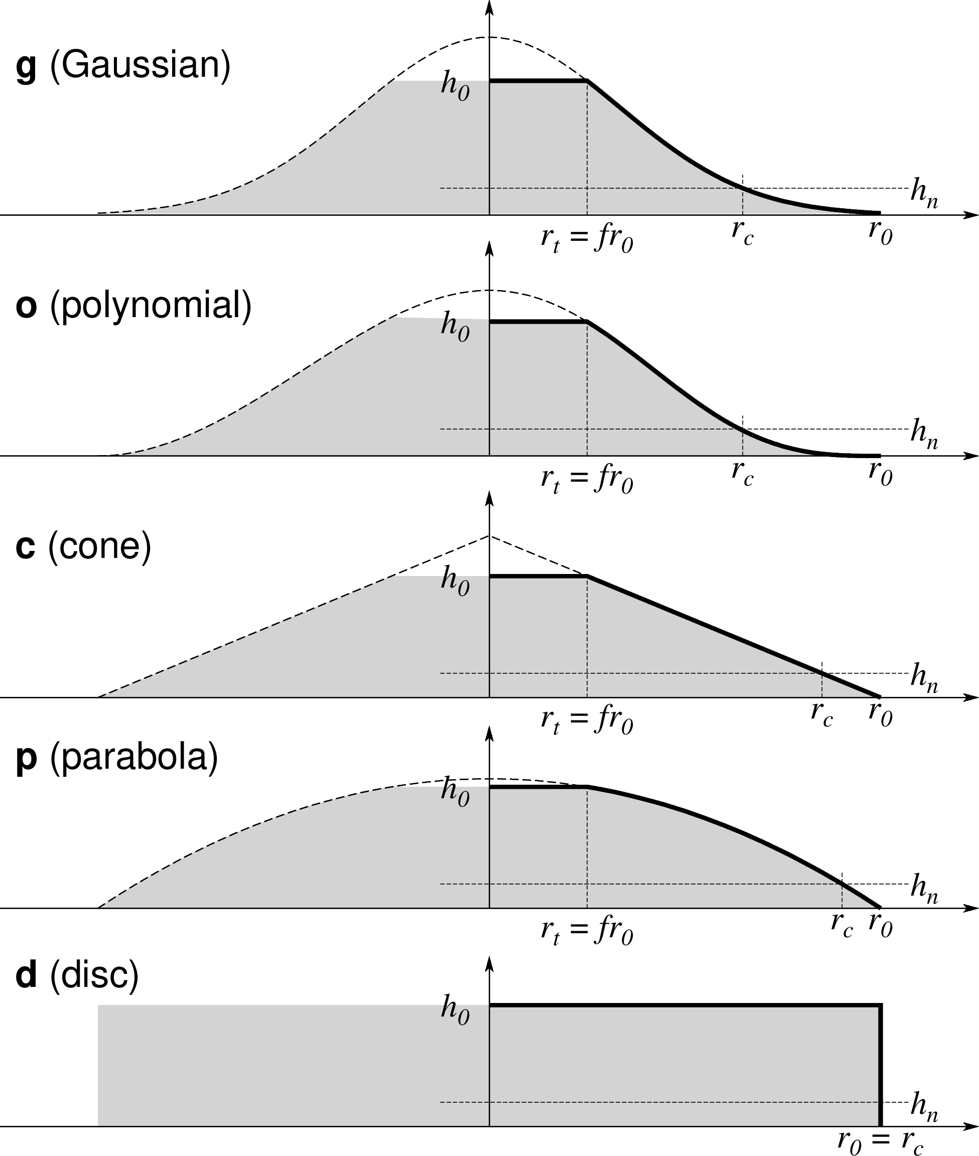 在上述所有海山中, \(h_0\) 是海山最大高度,\(r_0\) 为基底半径, \(h_n\) 是相对于 -L [0] 指定的噪声基底的高度,f 是 -F 选项设置的 平顶海山相关的参数。平顶部分的半径为 \(r_t\) , 对于圆盘形状海山,不存 在该参数。