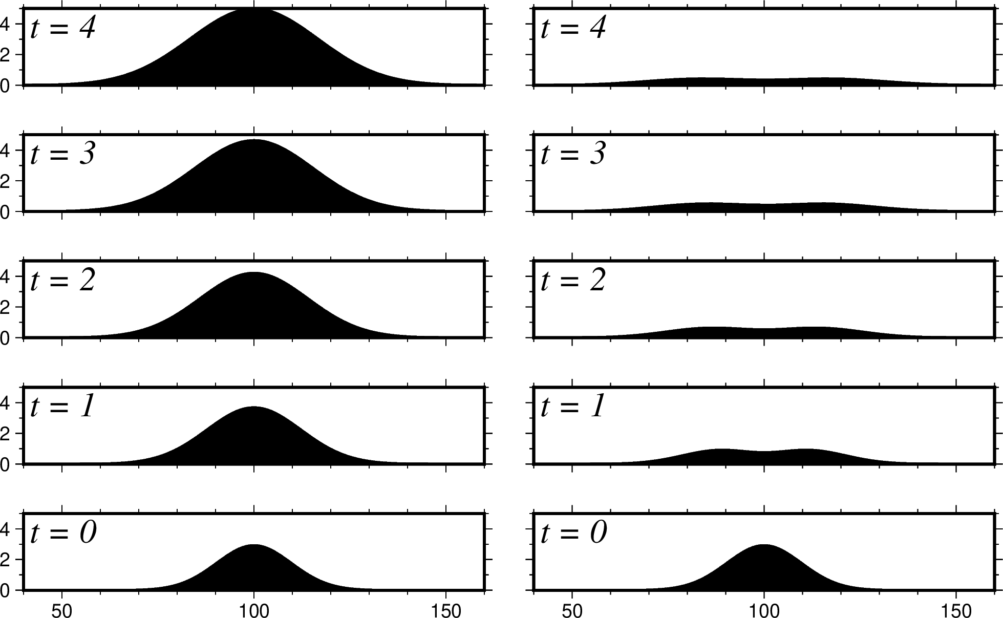 bmode 两种情况下的海山图(高斯海山,没有平顶,体积线性变化),横坐标 为海山水平方向的尺度,纵坐标为海山的高度,以二维的变化来显示海山的演化。 左图为使用 c 的情况,表示使用实际地形,也就是随时间累积的地形; 右图为使用 i 的情况,显示了地形随时间变化的增量