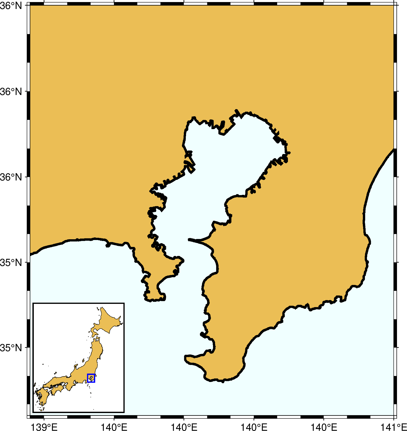 gmt coast -R139.2/140.5/34.8/36 -JM12c -Baf -BWSne -W2p -A1000 -Glightbrown -Sazure1 --FORMAT_GEO_MAP=dddF