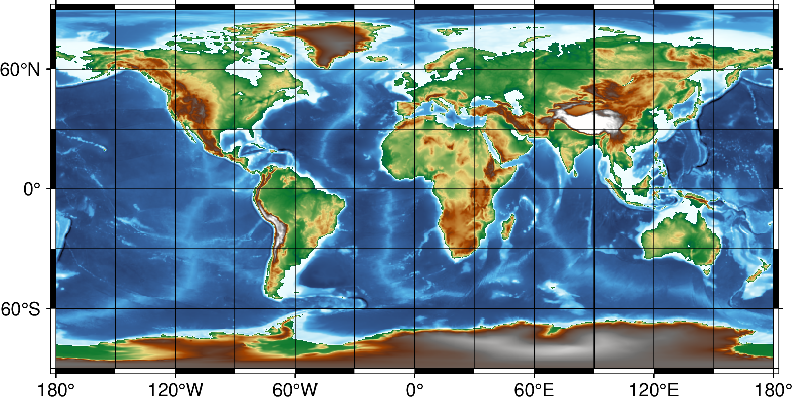 gmt grdimage @earth_relief_30m -Rd -JQ12c -B60f30g30