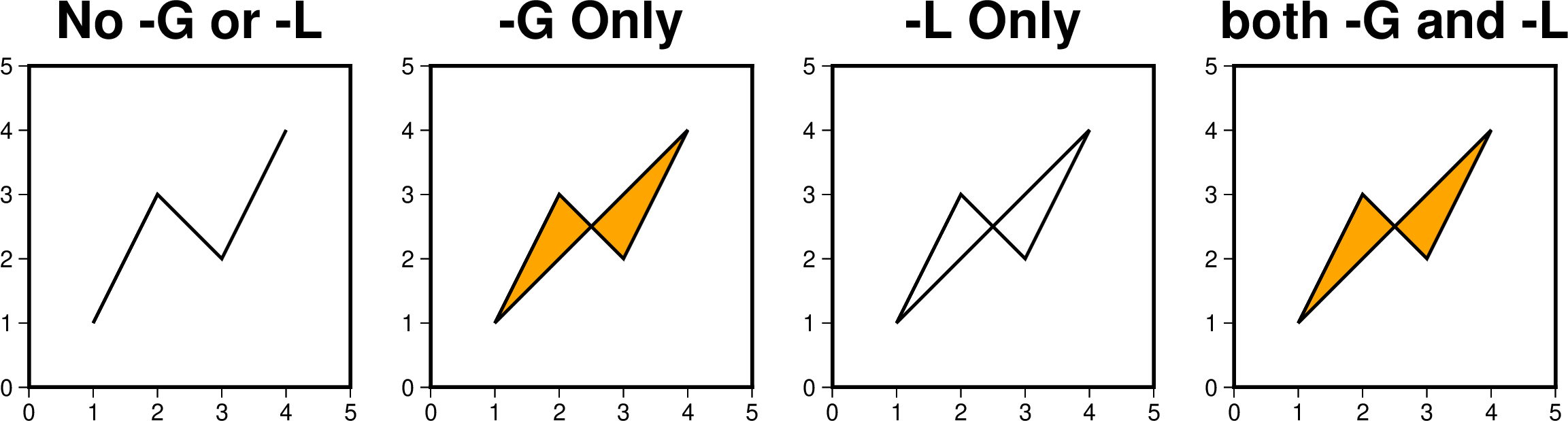#!/usr/bin/env bash cat << EOF > t.txt 1 1 2 3 3 2 4 4 EOF cmd='t.txt -R0/5/0/5 -JX4c -W1p -Ba1f1' gmt begin plot_-L_1 gmt plot $cmd -BWStr+t'No -G or -L' gmt plot $cmd -BWStr+t'-G Only' -Gorange -X5c # -L选项中的+p子选项对画笔的外观设置一律无效 # 没有-G选项时,使用-L选项必须使用+p子选项,但相关设置无效 gmt plot $cmd -BWStr+t'-L Only' -L+p10p,blue -X5c gmt plot $cmd -BWStr+t'both -G and -L' -Gorange -L+p10p,blue -X5c gmt end show rm t.txt
