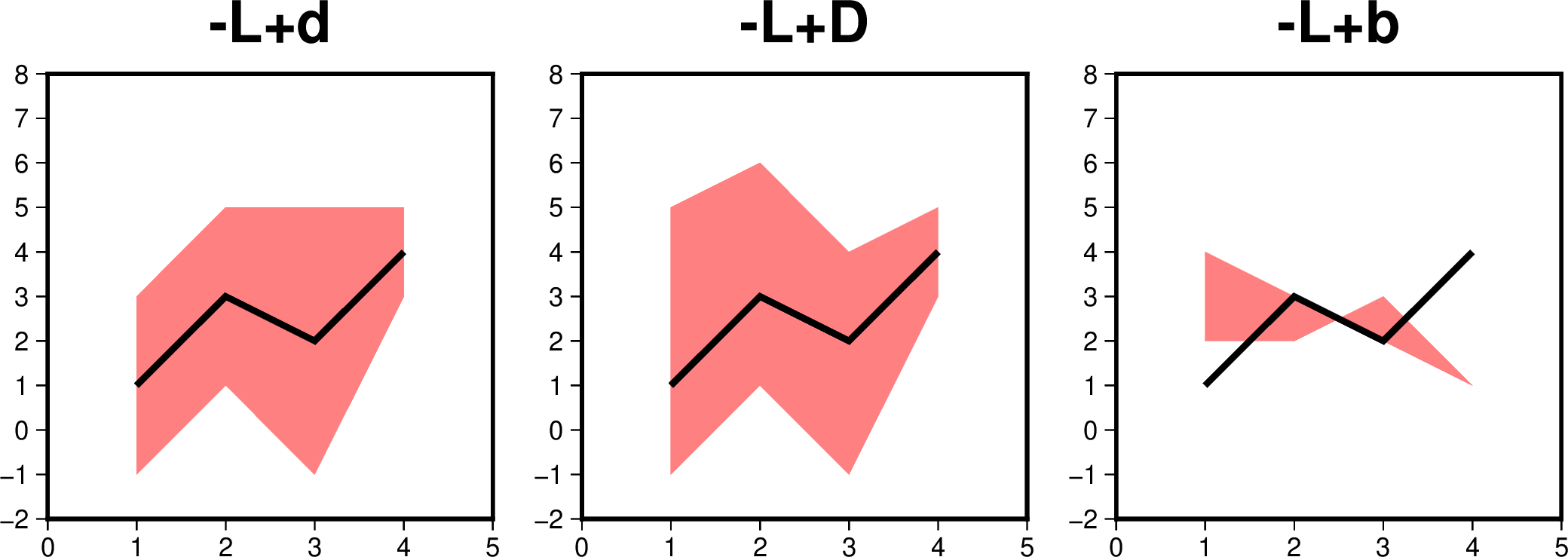 +d选项,数据的第三列分别是2、2、3和1, 所以包络的上下范围在线条的每一个数据点处距离线条的距离就是2、2、3和1。 第二幅图使用+D选项,数据的第三列分别是2、2、3和1, 所以包络的下范围在线条的每一个数据点处距离线条的距离就是2、2、3和1, 也就是和第一幅图完全相同。但是,上范围的距离使用的是数据文件的第四列,也就是4、3、2和1。 第三幅图使用+b选项,包络的范围与线条的位置无关。第三、四列数据分别决定了包络的上下范围。 当第三、四列数据交叉的时候,包络图形随之出现打结的现象。#!/usr/bin/env bash cat << EOF > t.txt 1 1 2 4 2 3 2 3 3 2 3 2 4 4 1 1 EOF cmd='t.txt -R0/5/-2/8 -JX5c -W2p -Ba1f1 -Glightred' gmt begin plot_-L_2 gmt plot $cmd -BWStr+t"-L\053d" -L+d gmt plot $cmd -BWStr+t"-L\053D" -L+D -X6c gmt plot $cmd -BWStr+t"-L\053b" -L+b -X6c gmt end show rm t.txt