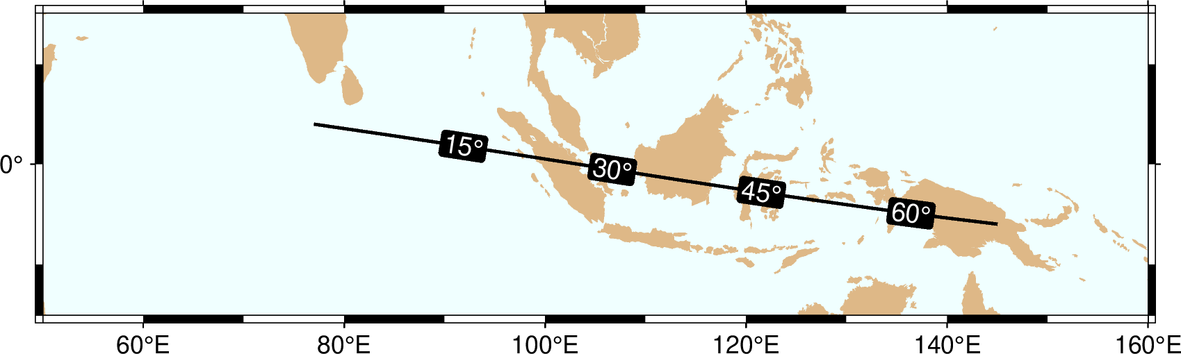 gmt plot -R0/360/-60/60 -JM10c -Bx60 -By15 -Sc2c -png test << EOF 360 0 EOF