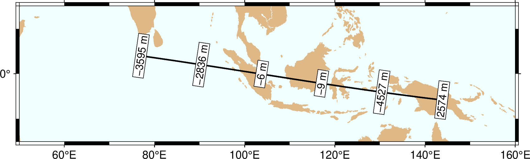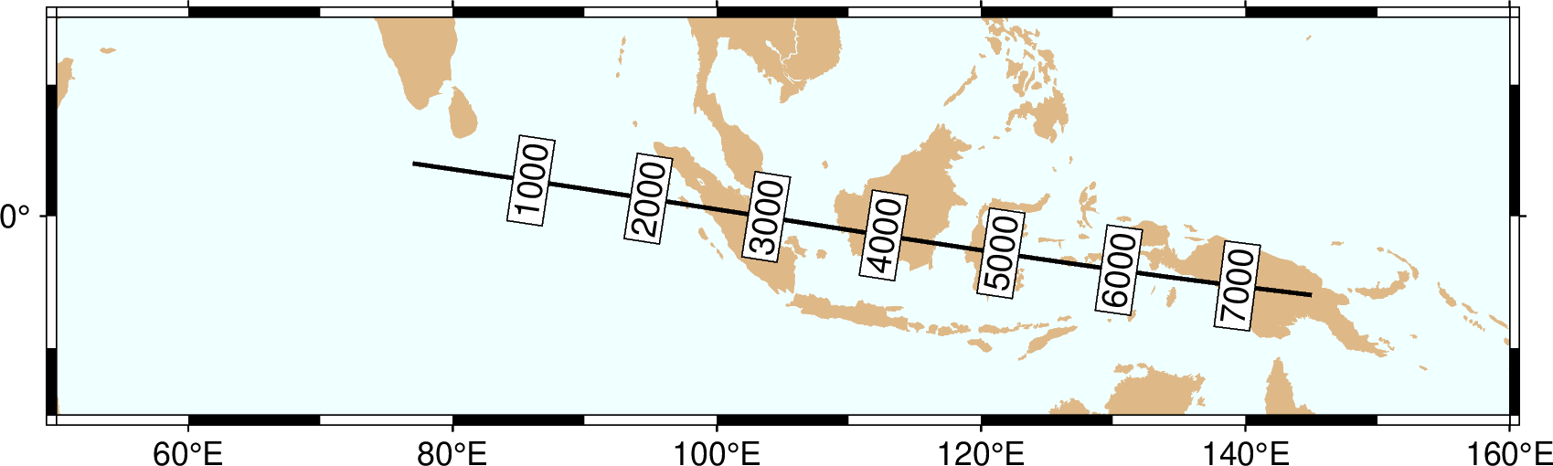 第三个示例采用沿大圆弧的海底地形数据作为标注的内容,按照沿大圆弧的距离,每1500km放置一个标注。 因此需要使用 gawk 程序从 @App_O_transect.txt 文件中抽取距离为1500km倍数的记录,并创建一个新文件,指定标注的位置和内容。