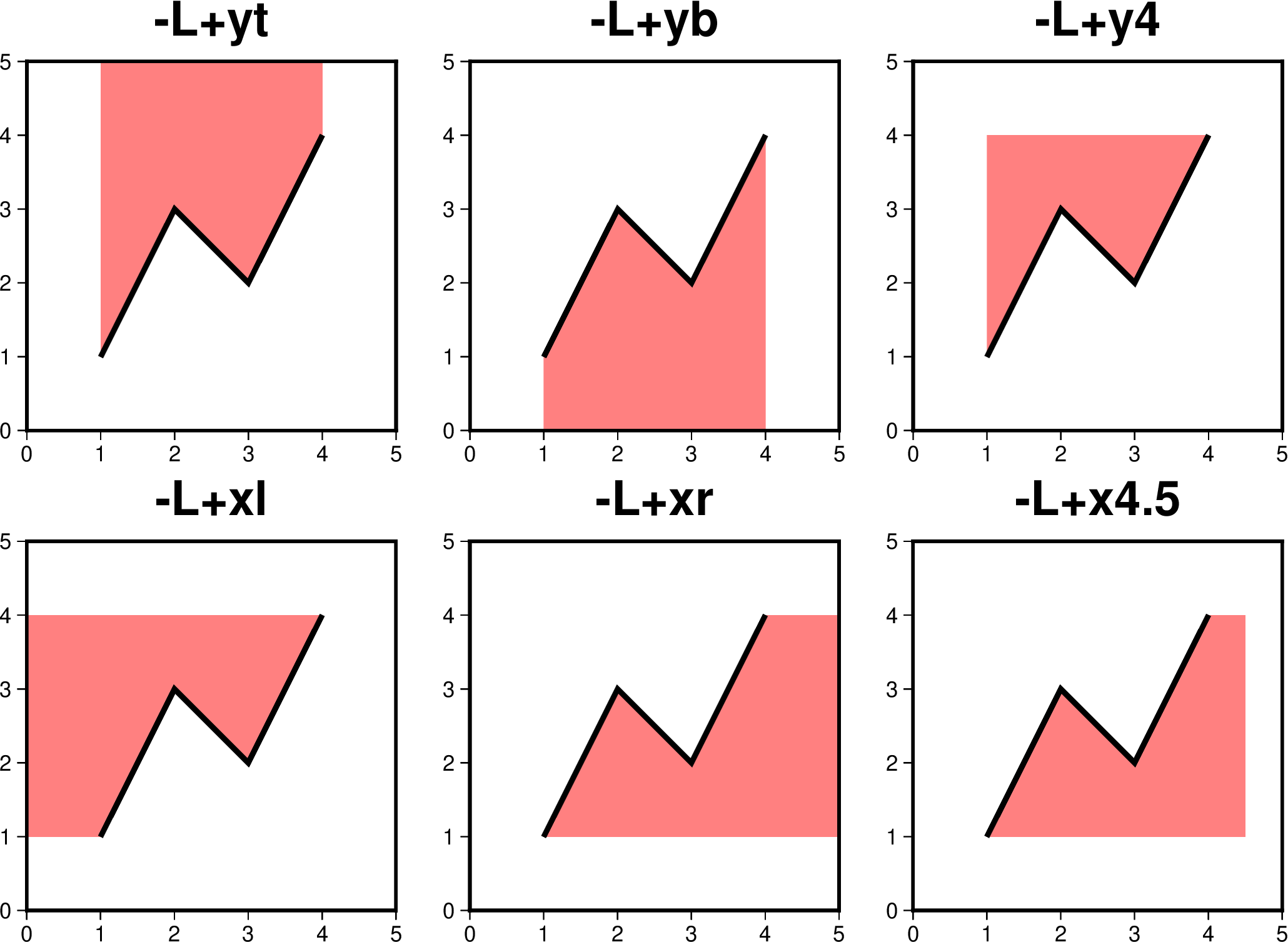 #!/usr/bin/env bash cat << EOF > t.txt 1 1 2 3 3 2 4 4 EOF cmd='t.txt -R0/5/0/5 -JX5c -W2p -Ba1f1 -Glightred' gmt begin plot_-L_3 gmt plot $cmd -BWStr+t"-L\053xl" -L+xl gmt plot $cmd -BWStr+t"-L\053xr" -L+xr -X6c gmt plot $cmd -BWStr+t"-L\053x4.5" -L+x4.5 -X6c gmt plot $cmd -BWStr+t"-L\053yt" -L+yt -X-12c -Y6.5c gmt plot $cmd -BWStr+t"-L\053yb" -L+yb -X6c gmt plot $cmd -BWStr+t"-L\053y4" -L+y4 -X6c gmt end show rm t.txt