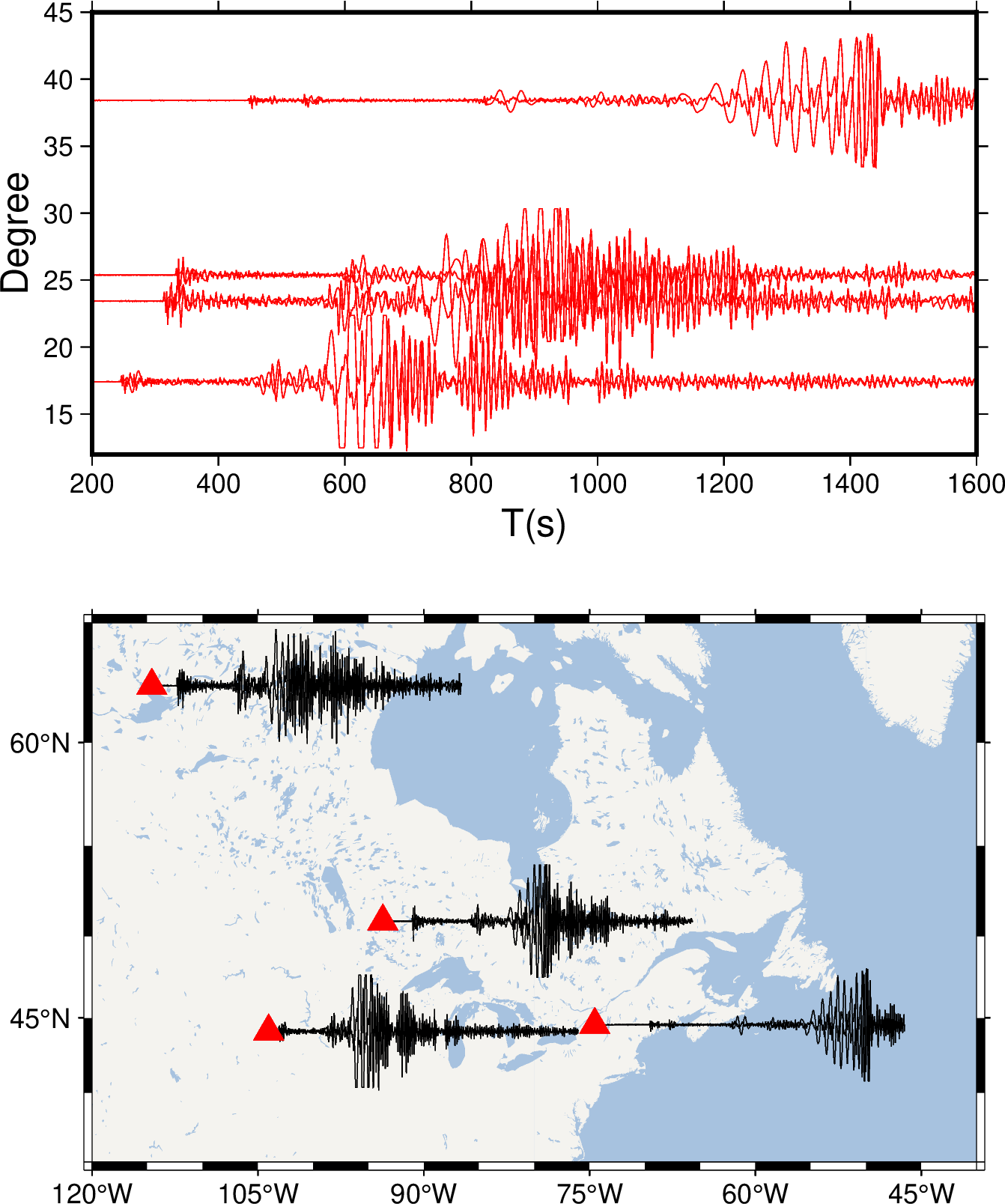 利用 SAC 命令 datagen sub teleseis *.z 生成多个波形,将其绘制在距离剖面和地图上: