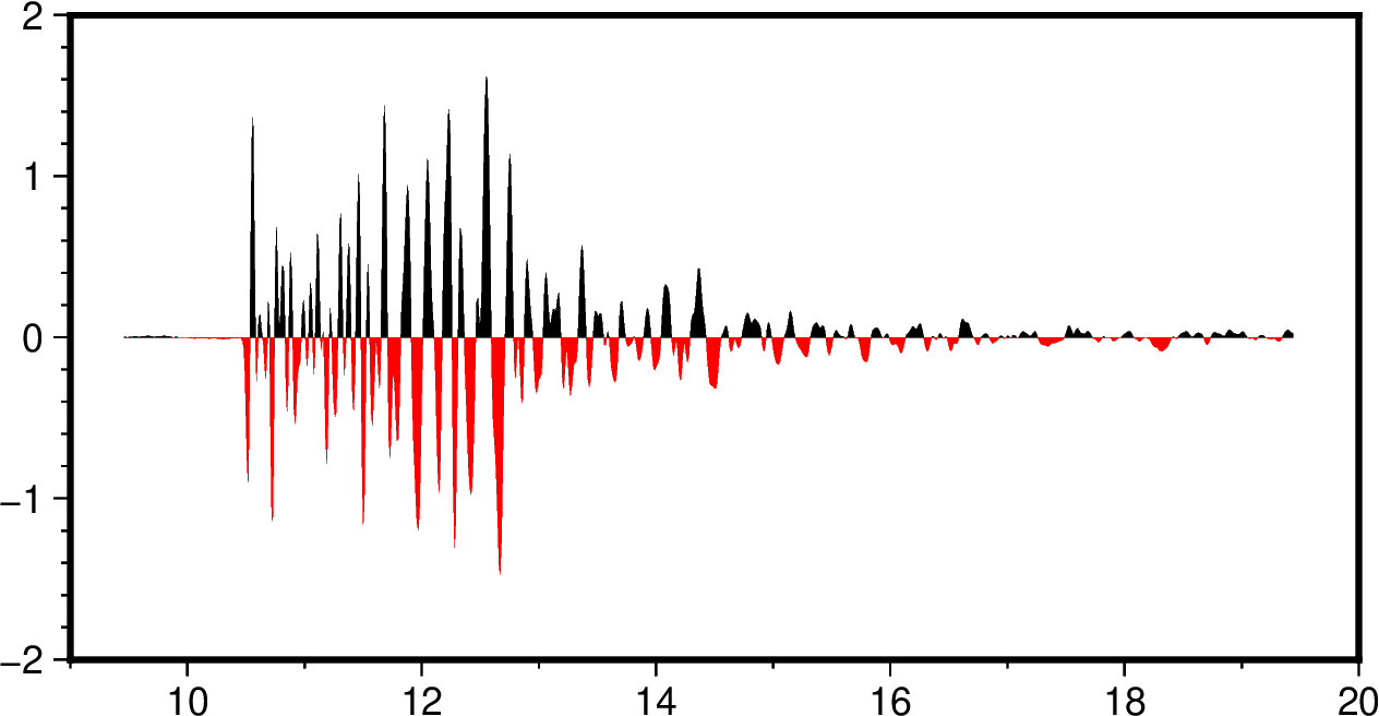 利用 SAC 的命令 funcgen seismogram 生成单个波形文件 seis.SAC 并绘制, 分别为正负部分涂色:
