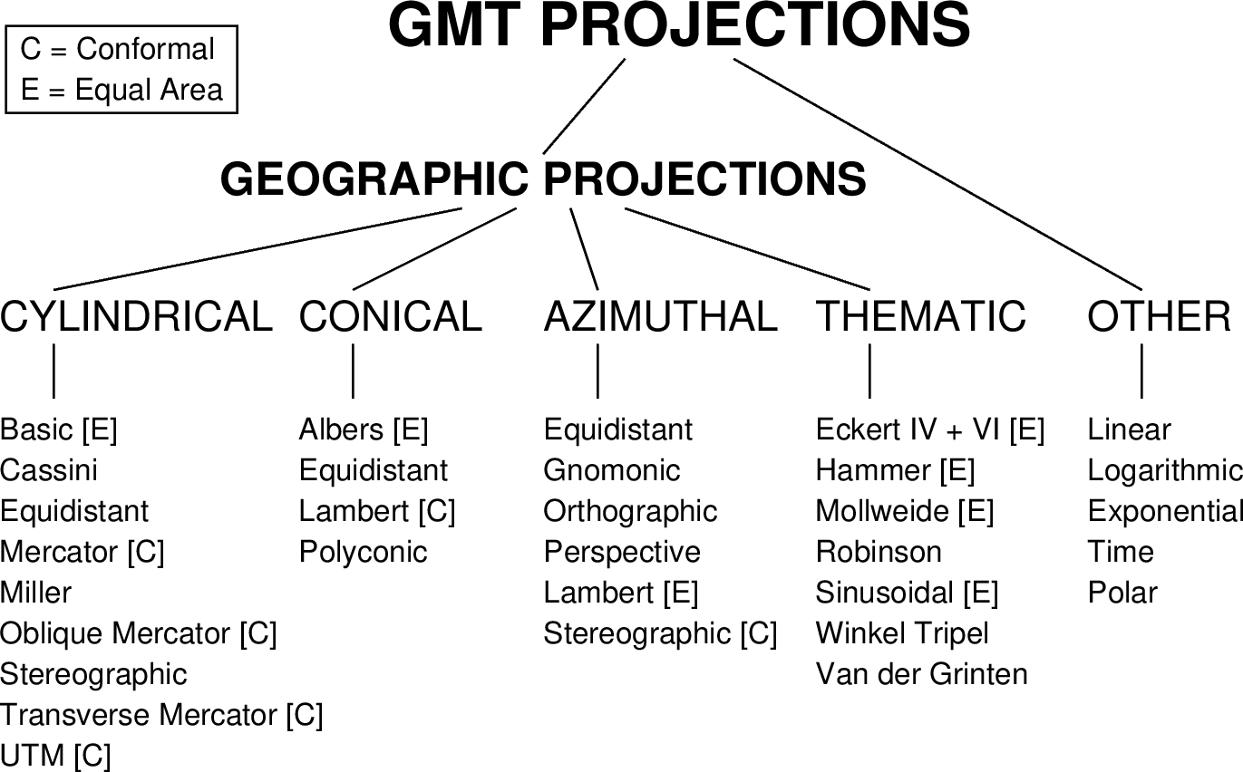 GMT 读取数据的实际坐标,并将其转换或者投影到图片的对应位置。当前,GMT 支持 30 多种坐标变换或投影方式。 这些投影方式可以分为三类,每一类又可以细分为几个小类: