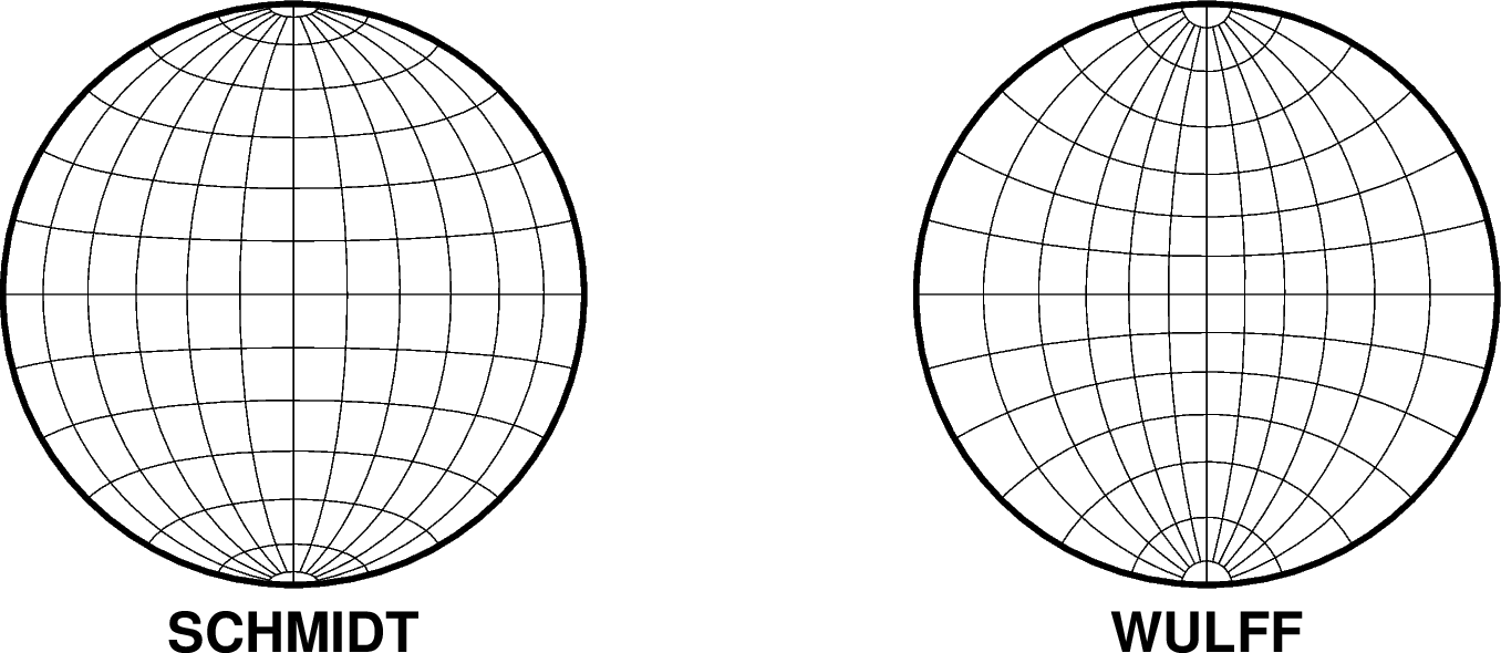 震源球投影:等面积的 Schmidt 网和等角度的 Wulff 网