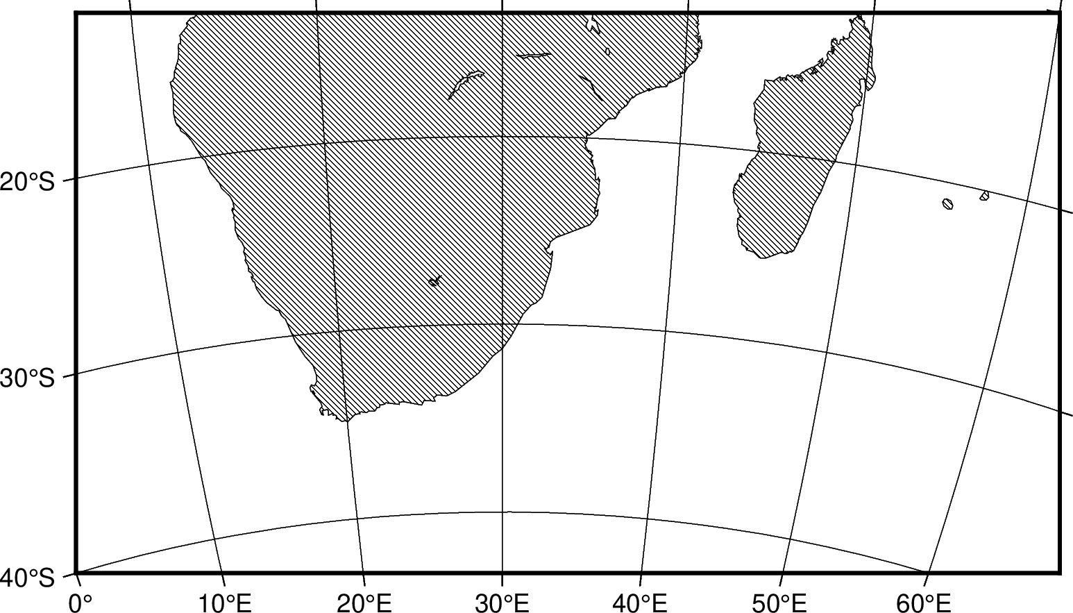 此投影下,经线和纬线通常不是直线,因而不适合直接用经纬线指定地图边界。 本例中通过指定区域的左下角(0°E/40°S)和右上角(60°E/10°S)的坐标来指定区域范围。 -R 中 +r 用于告诉 GMT 此处指定的是左下角和右上角的坐标。