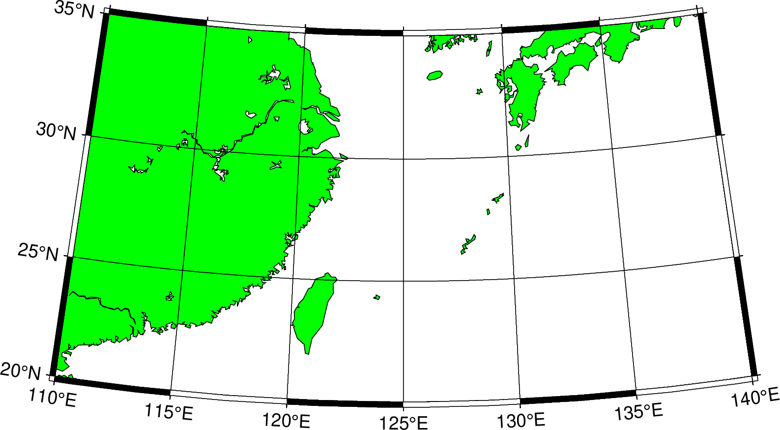 下图绘制了台湾附近的区域,投影中心位于 125°E/20°N,25 度和 45 度纬线是两条标准纬线。