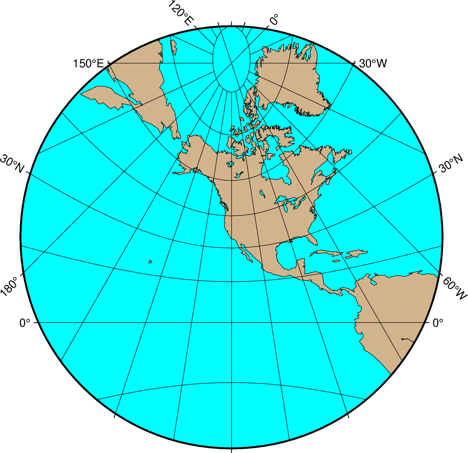 gmt coast -Rg -JF-120/35/60/12c -B30g15 -Dc -A10000 -Gtan -Scyan -Wthinnest -png GMT_gnomonic