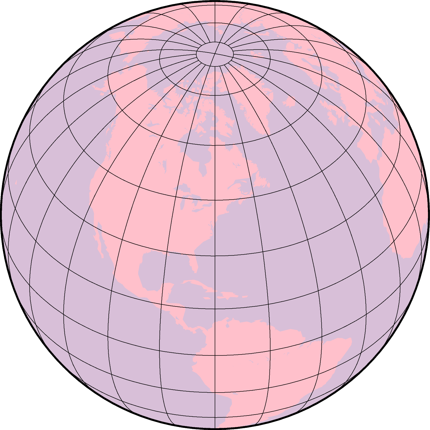 Azimuthal orthographic(正射方位投影)是一种从无穷远距离处的透视投影,因而常用于绘制从外太空看地球。 与 Lambert 等面积投影以及立体投影类似,一次只能看到一个半球。 该投影既不是等面积也不是保角,在半球边界处有较大畸变。 从投影中心出发的任意方向是真实的。