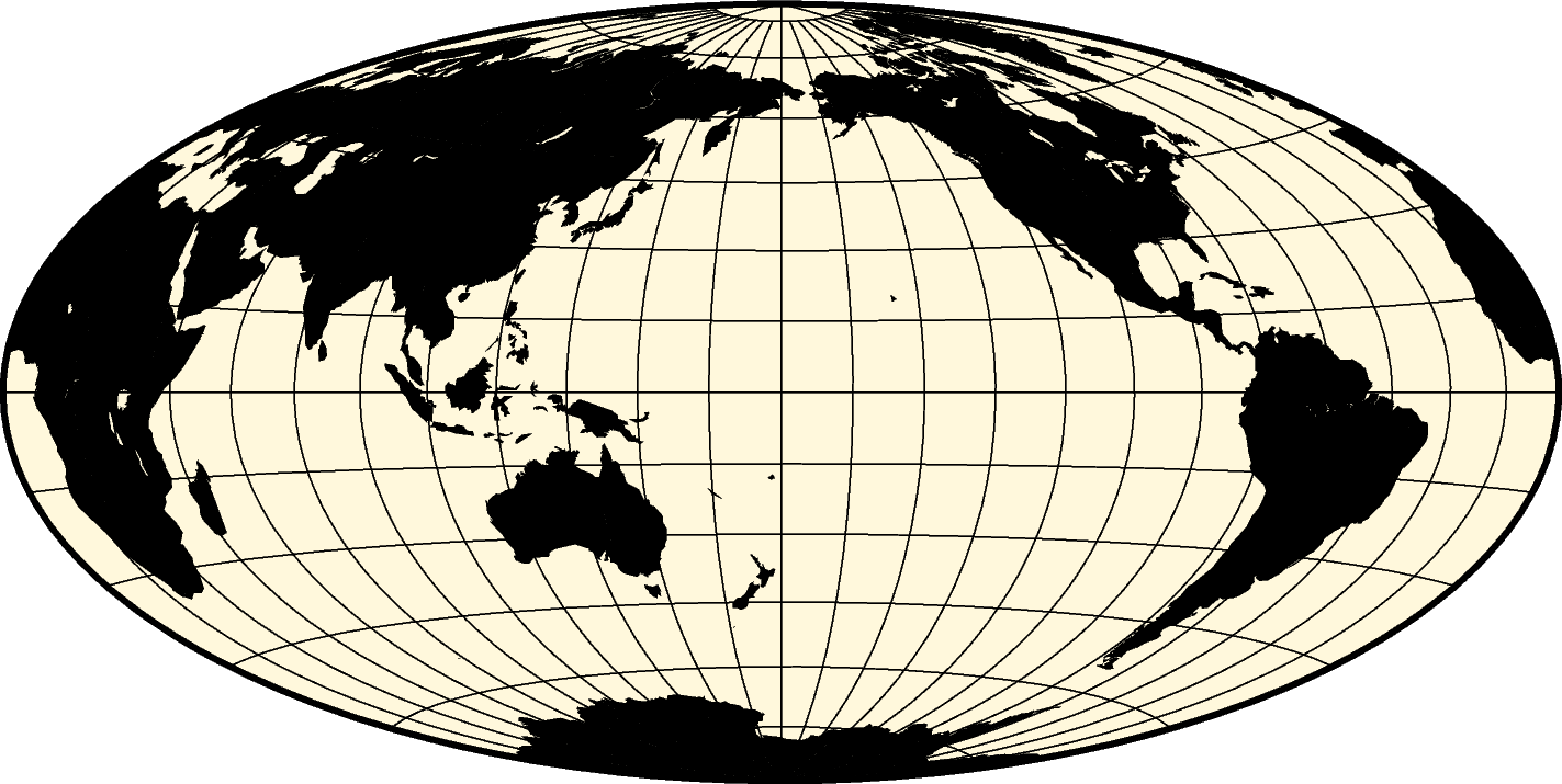 Hammer equal area(等面积 Hammer 投影)由德国数学家 Ernst von Hammer 于 1892 年提出, 也被称为 Hammer-Aitoff 投影(Aitoff 投影与之看起来相似,但不等面积)。 投影后的边界是一个椭圆,赤道和中心经线是直线,其余纬线和经线都是复杂曲线。