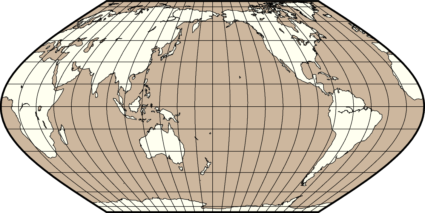 Eckert IV/VI equal area(Eckert IV/VI 等面积投影) 由 Max Eckert-Greiffendorff 于 1906 年提出,是伪圆柱等面积投影。 中心经线以及所有的纬线都是直线,其余经线是等间隔分布的椭圆弧(IV)或正弦曲线(VI)。 比例尺在纬线 40°30’(IV)和 49°16’(VI)是真实的。-JKf(f 代表 four)表示使用 Eckert IV 投影,-JKs(s 代表 six)表示使用 Eckert VI 投影。 若不指定 f 或 s,则默认使用 Eckert VI 投影。