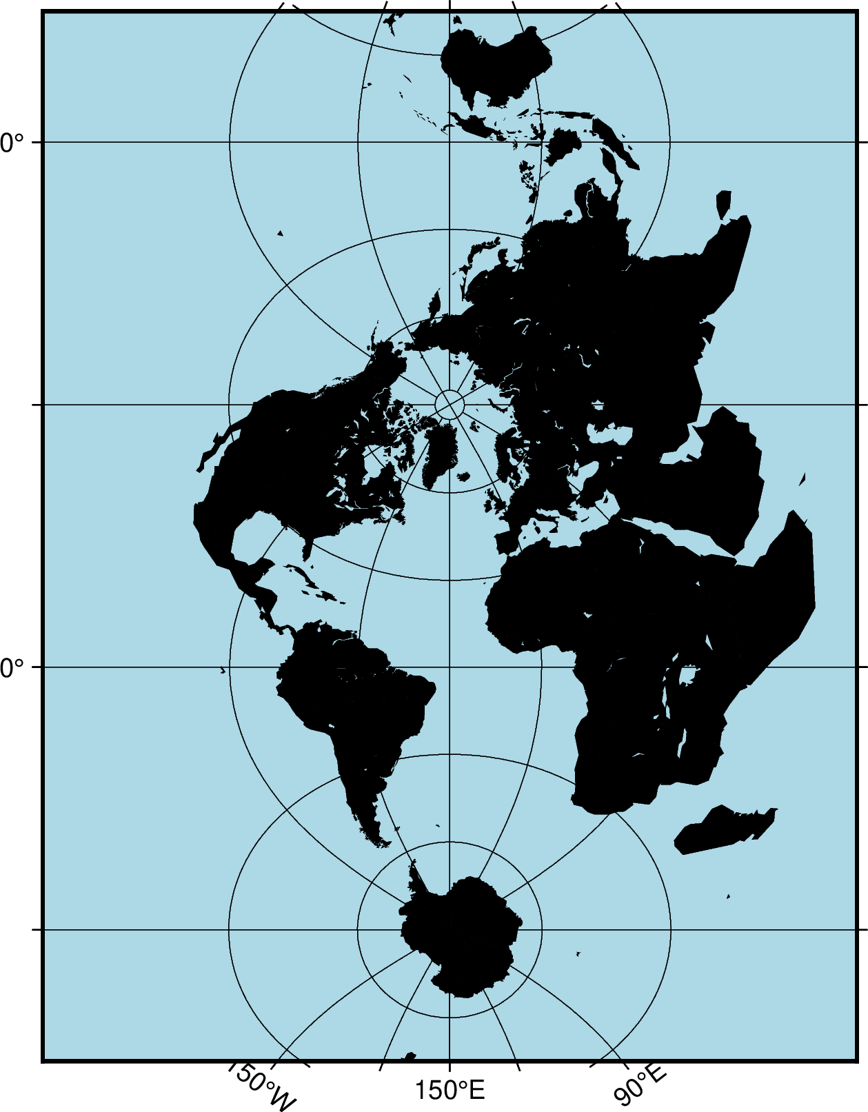 gmt coast -R0/360/-80/80 -JT330/-45/10c -Ba30g -BWSne -Dc -A2000 -Slightblue -G0 -png GMT_TM