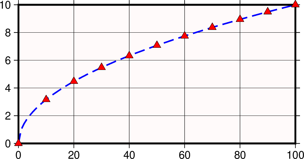 gmt plot -R0/100/0/10 -JX3i/1.5i -Bag -BWSne+gsnow -Wthick,blue,- sqrt.txt