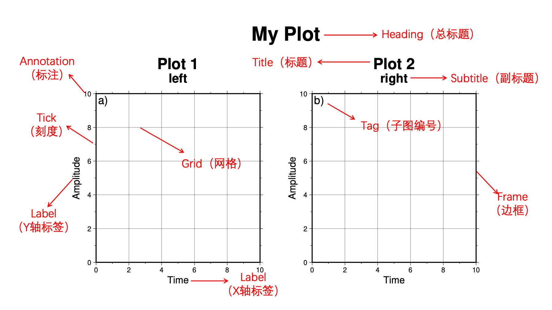 下图展示了 GMT 绘图时底图中各个元素的英文名称以及本手册中对应的中文名称。 建议读者记住底图各个元素的中英文名称以方便查找和修改。