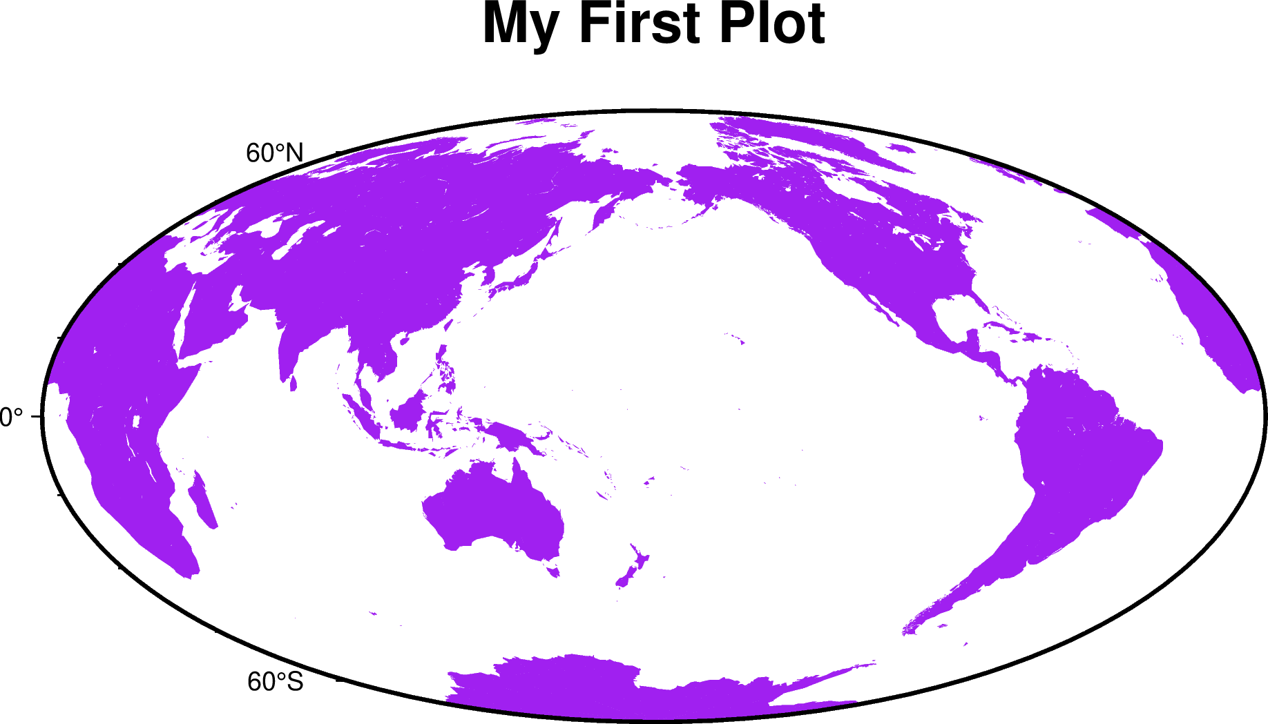 gmt coast -Rg -JH15c -Gpurple -Baf -B+t"My First Plot"