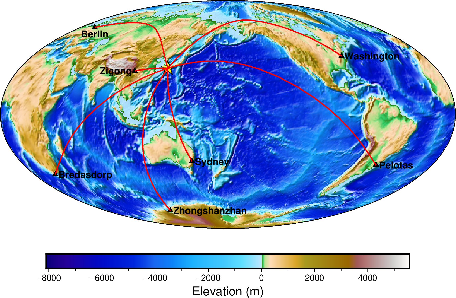 在前面几节中,我们已经学会了如何使用 GMT 绘制底图、海岸线、线段、符号、文字、 地形起伏等等。这一节我们将把前面学到的内容综合起来,试着去绘制下面这张 地震学经常见到的大圆弧路径图。在这一过程中,我们将试着去理解 GMT 中图层的概念。