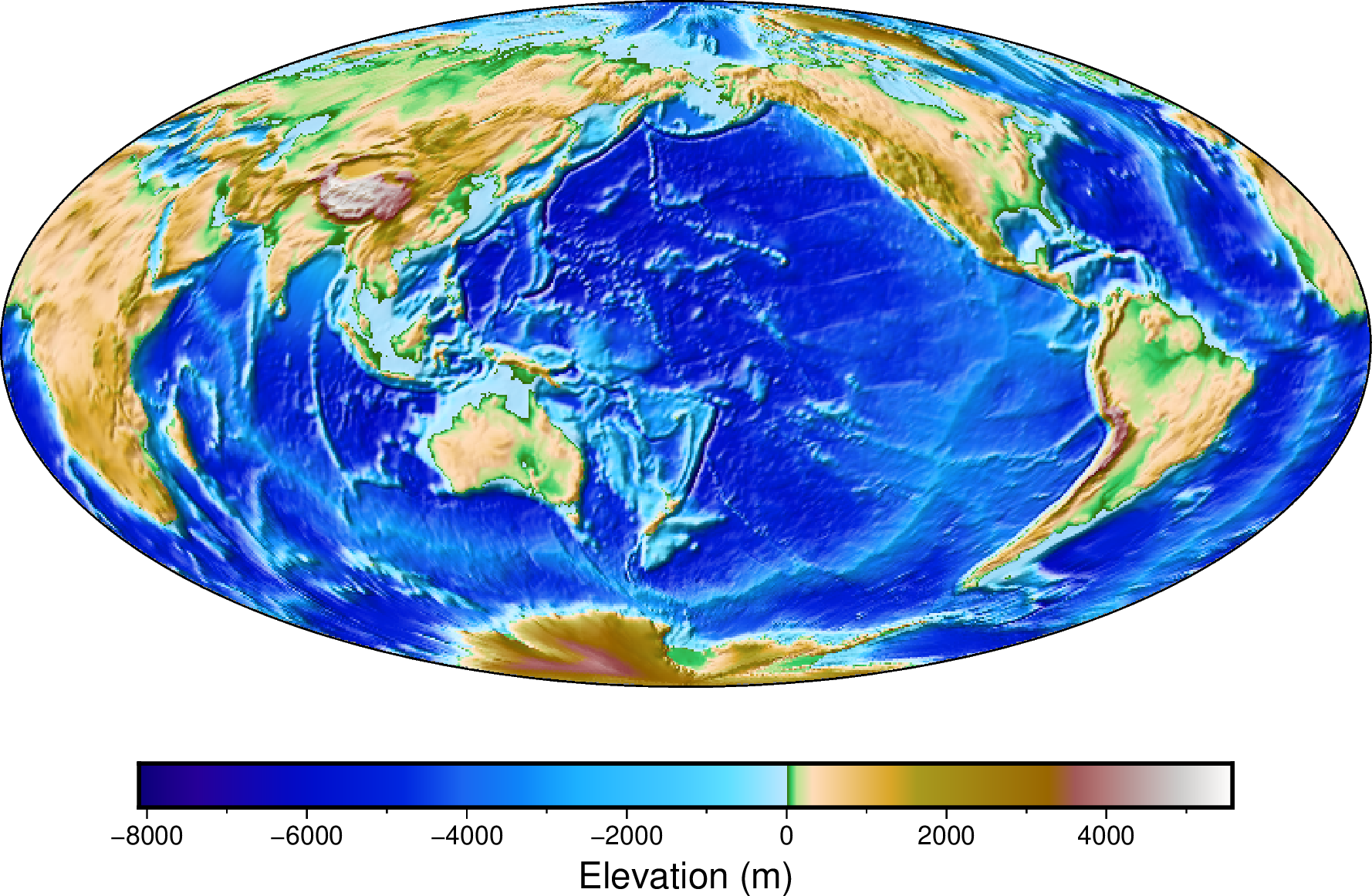 我们首先使用 grdimage 模块绘制底图,并使用 colorbar 模块添加色标: