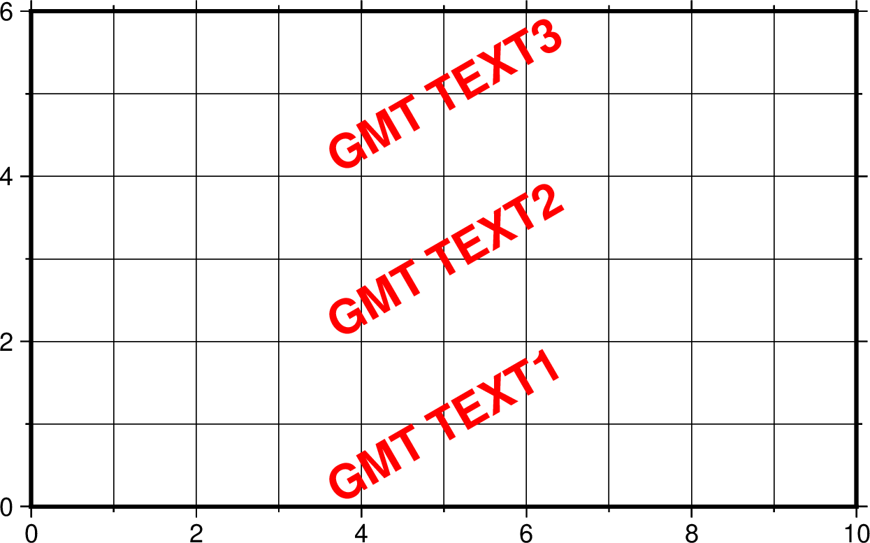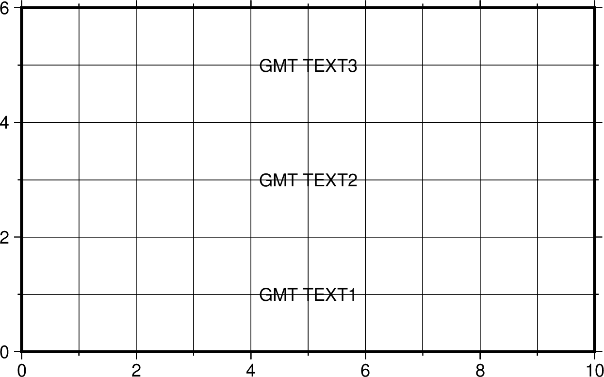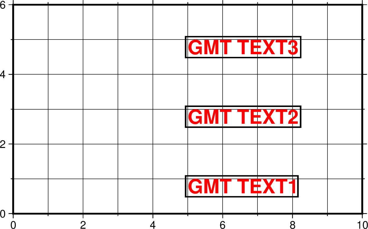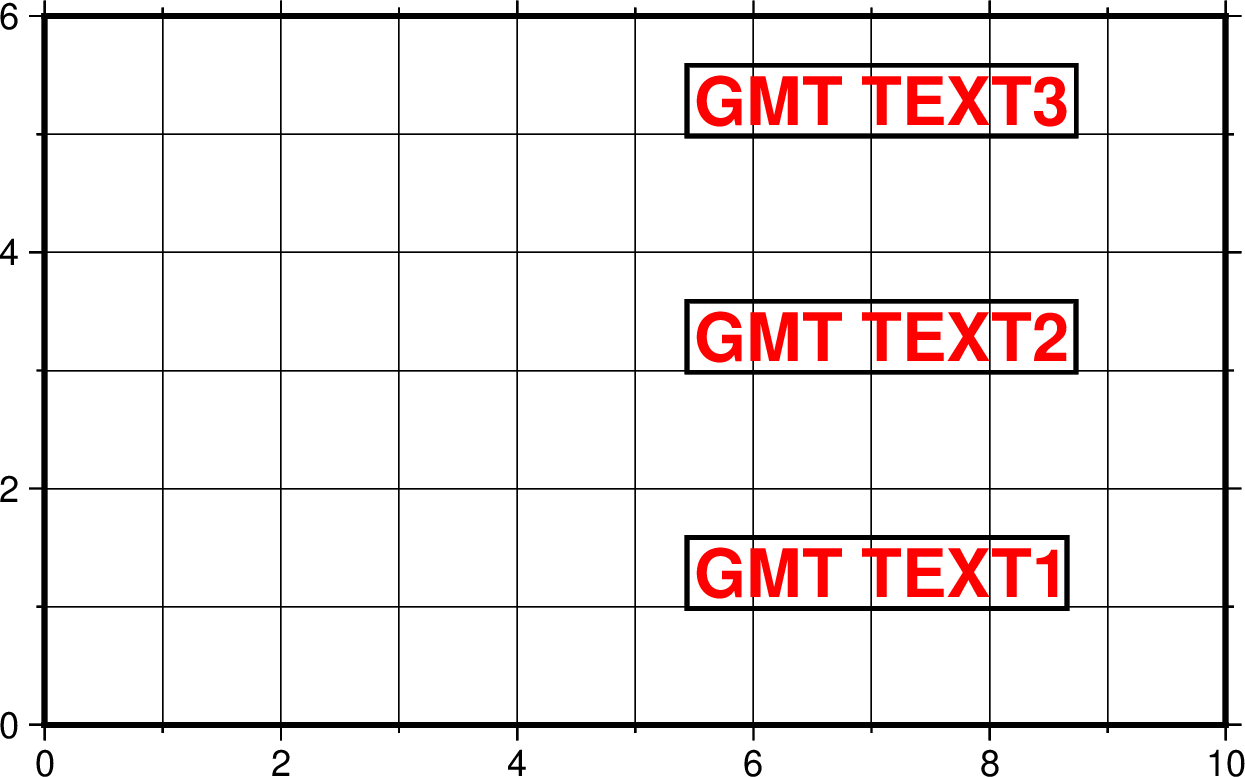 -F+j 用于指定文本对齐方式。下面的示例中,-F+jTL 表示文本对齐方式 为 TL(Top + Left),即表示以左上角方式对齐。从下图中可以看到,三个 文本框的左上角被放在了 (5,1)、(5,3) 和 (5,5) 处。