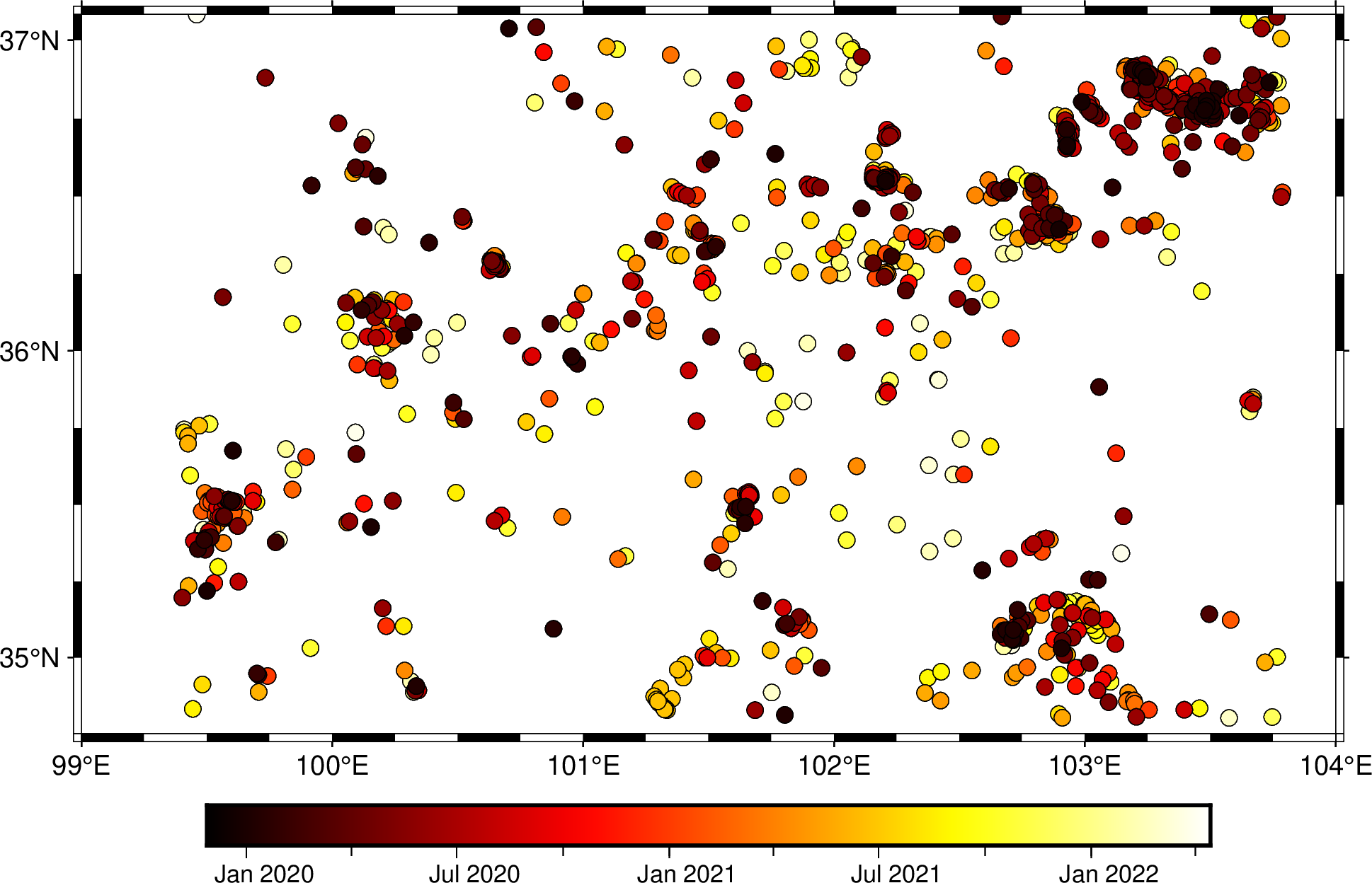 本例根据地震发震时刻绘制不同颜色的圆,这个例子展示了GMT拥有强大的时间格式处理能力。
