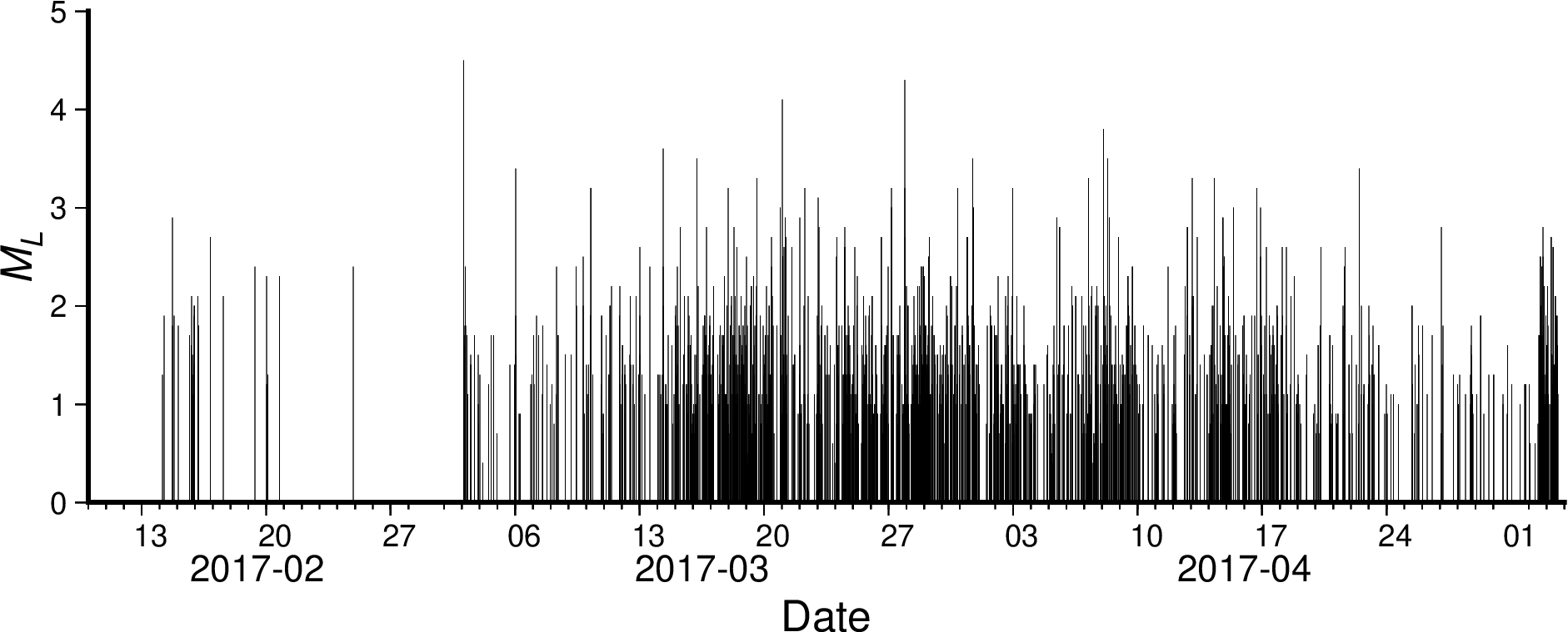 数据文件为两列,第一列是以 “YYYY-mm-ddThh:mm:ss” 格式给出的地震发震时刻,第二列是地震震级。 使用 plot 模块的 -Sb 选项可以将以上格式的数据绘制为地震 M-T 图。