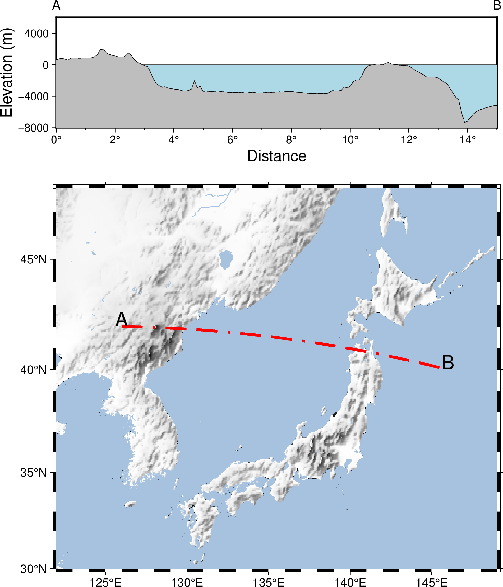 gmt basemap -R0/15/-8000/6000 -JX12c/3c -Bya4000+l"Elevation (m)" -Bxa2f1+l"Distance"+u"\260" -BWSrt -Y12c