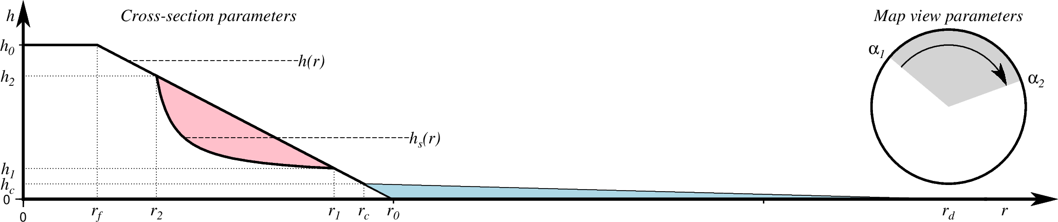 上图为自适应的近似滑坡几何图,其中使用了 +d ,+h 以及 +a 选项。 滑坡的体积(粉红色)在滑动的过程中将逐渐沉积在浅蓝色部分,沉积物从高度 \(h_c\) 开始,线性变化到 \(r_d\) 时变为 0。其中与半径相关的参数 都是从海山的高度以及形状中计算得到的。注 : \(h_2 > h_1\) , \(r_1 > r_2\)