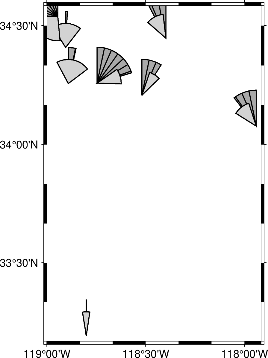 从文件或标准输入读取数据值,并在地图上绘制所选的大地测量符号。 可以选择速度矢量及其不确定度、旋转楔形及其不确定度、各向异性矢量或应变十字。 符号的填充或其轮廓可以基于固定参数或通过颜色查找表 CPT 进行着色。